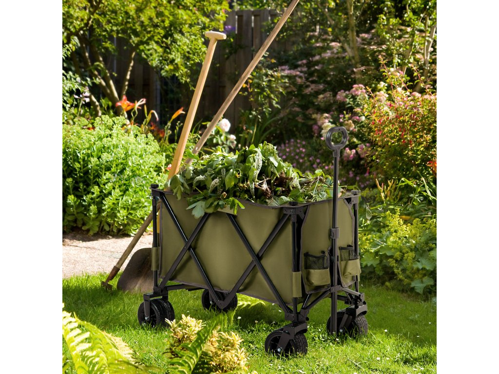 - Praktický přepravní vozík: Díky velkému vnitřnímu prostoru a přídavné úložné tašce je tento skládací ruční vozík ideální pro nákupy, pláž, sport, kempování nebo jiné použití, kde se přepravují předměty. Nastavitelnou rukojeť lze přizpůsobit různým velikostem postavy a tento zahradní vozík má pevnou kovovou rámovou konstrukci s vnitřním úložným prostorem o objemu 200 litrů a unese až 264 lbs/120 kg nákladu.