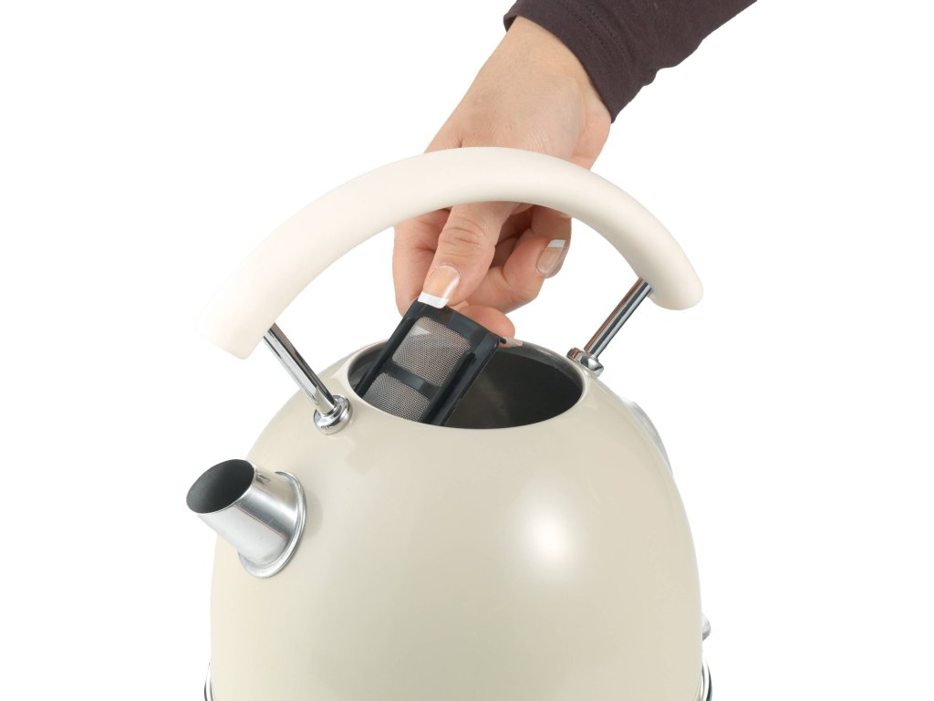 Nerezová rychlovarná konvice • vintage retro design • příkon: 2000 W • 360° otočná základna • objem: 1,7 l • indikátor úrovně vody • vnitřní odnímatelný odvápňovací filtr