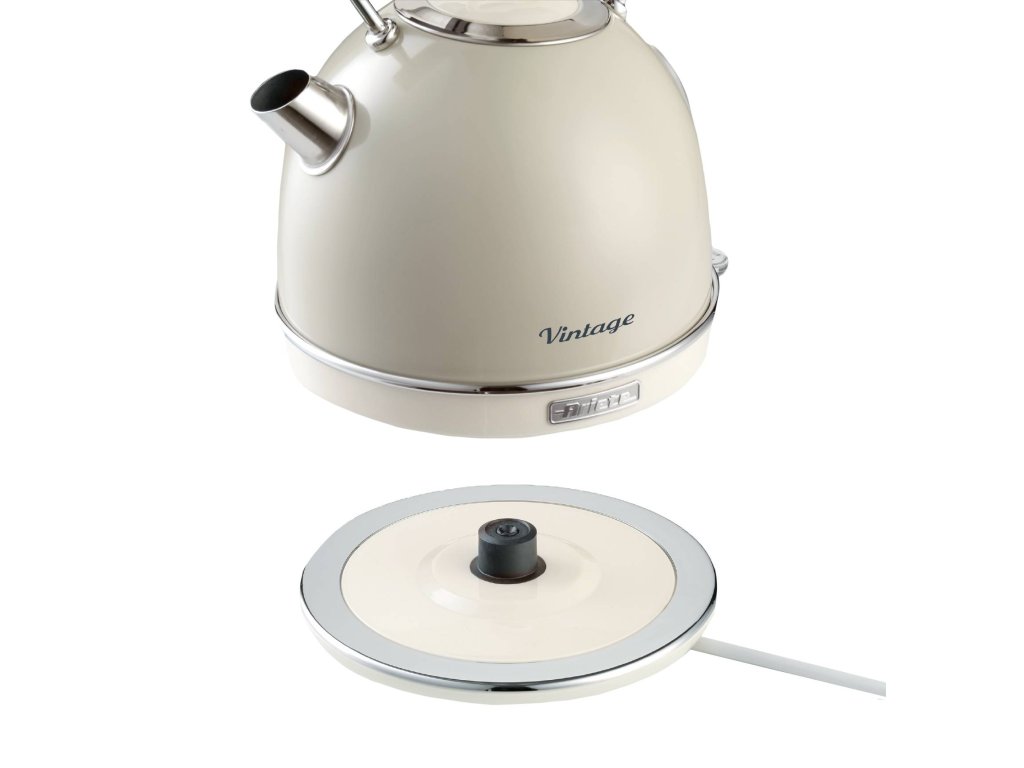 Nerezová rychlovarná konvice • vintage retro design • příkon: 2000 W • objem: 1,7 l • 360° otočná základna • vnitřní odnímatelný filtr proti vodnímu kameni • ukazatel vodní hladiny