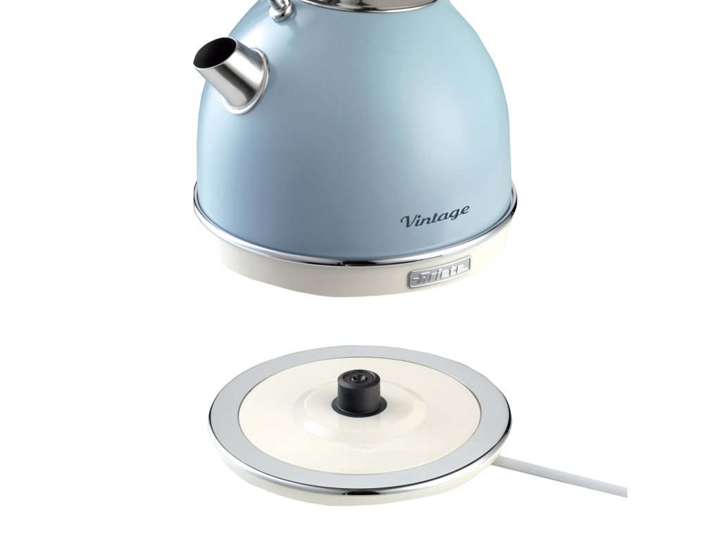 Nerezová rychlovarná konvice • vintage retro design • příkon: 1630 W • objem: 1 l • 360° otočná základna • vnitřní odnímatelný filtr proti vodnímu kameni • ukazatel vodní hladiny
