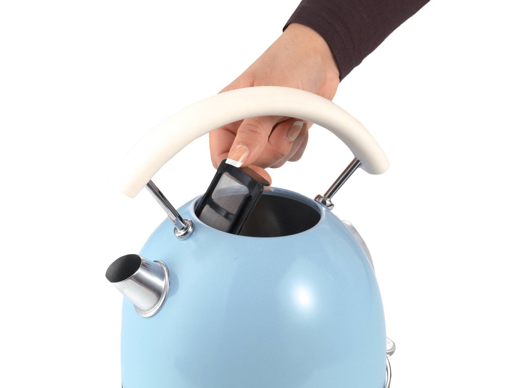 Nerezová rychlovarná konvice • vintage retro design • příkon: 2000 W • 360° otočná základna • objem: 1,7 l • indikátor úrovně vody • vnitřní odnímatelný odvápňovací filtr
