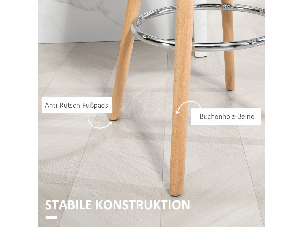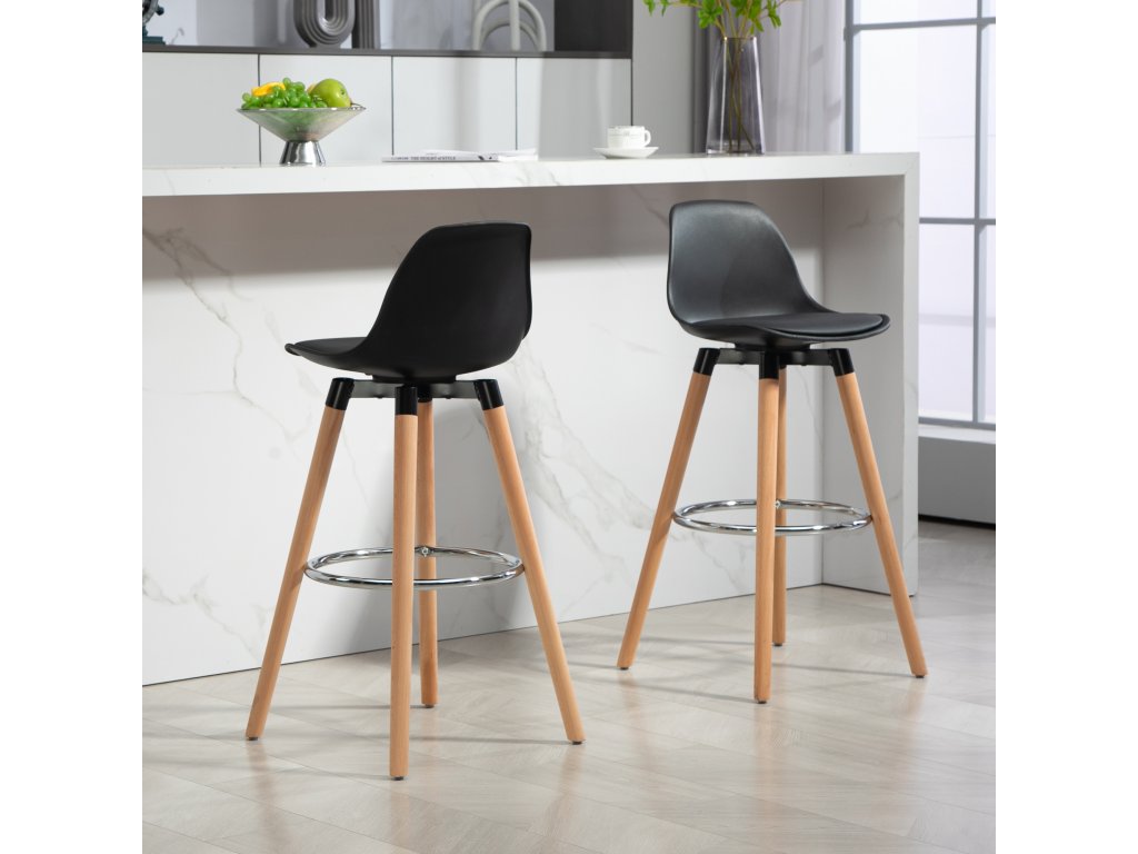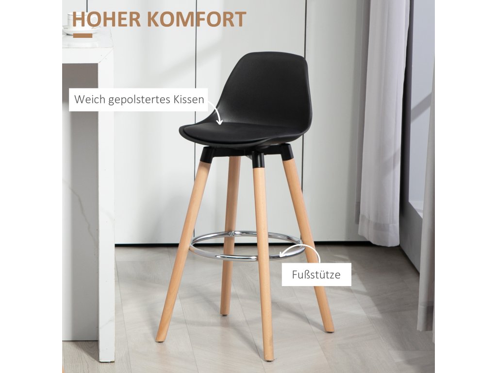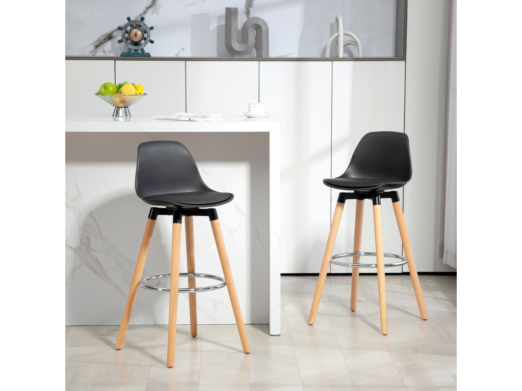 Skandinávský design a vysoká funkčnost charakterizují tuto sadu dvou barových židlí HOMCOM do vaší kuchyně nebo jídelny. Stoličky jsou velmi stabilní díky masivnímu dřevěnému rámu s protiskluzovou základnou, která poskytuje větší stabilitu a bezpečnost a zabraňuje převrácení. Ocelové podnožky vám umožní pohodlně si opřít nohy.