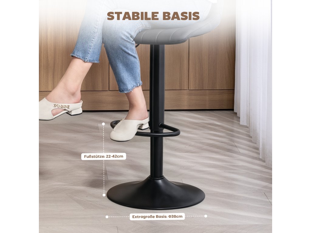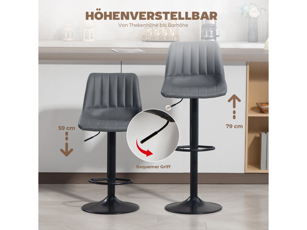Vynikající pohodlí: Vysoké stoličky s podnožkou, polstrovaným sedákem a opěradlem zajišťují pohodlné sezení. Výška sedáku je nastavitelná od 59 do 79 cm. Barová židle se otáčí o 360°.