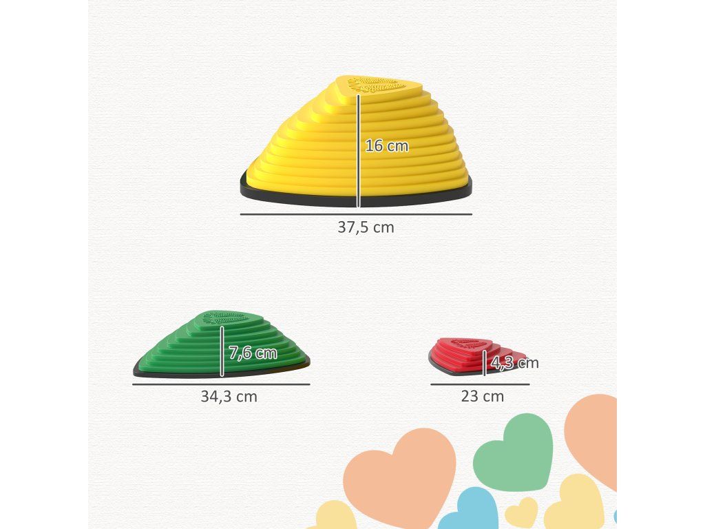 Rozměry balančních kamenů: Velké kameny: 37,5D x 37,5Š x 16V cm, Střední kameny: 34,3D x 34,3Š x 7,6V cm, Malé kameny: 23D x 23Š x 4,3V cm. Schválený věk: 3+ let. Doporučený věk: 3–8 let. Maximální nosnost: 80 kg.