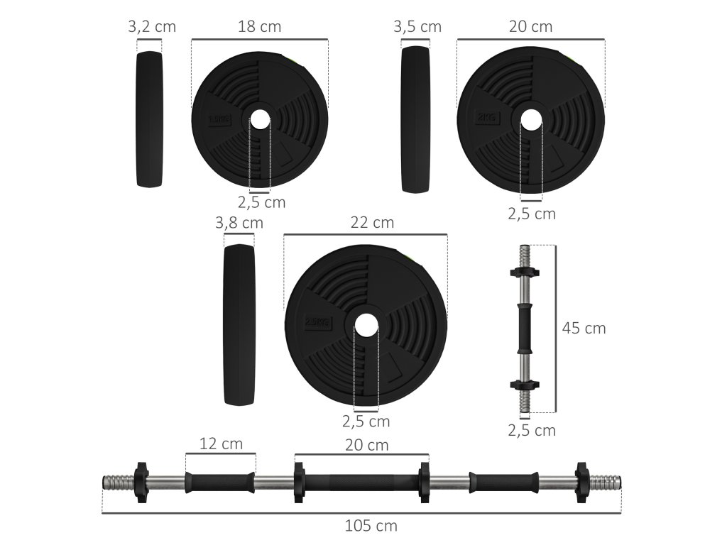 ✔ Rozměry závaží: (2,5 kg) Ø22 x 3,8T cm, (2 kg) Ø20 x 3,5T cm, (1,5 kg) Ø18 x 3,2T cm