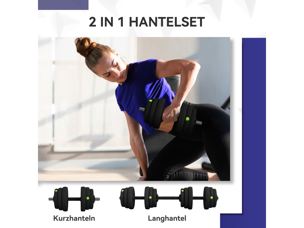 Proměňte své domácí cvičení s touto sadou činek 2 v 1 o hmotnosti 25 kg. Snadno přepínejte mezi činkami a činkou, abyste si mohli upravit trénink a přizpůsobit váhu své síle. Protiskluzové rukojeti a bezpečné objímky zajišťují bezpečný trénink. Plastový povrch poskytuje pevný úchop a chrání vaši podlahu. Ať už děláte kardio nebo budujete svaly – je čas vyrazit naplno!