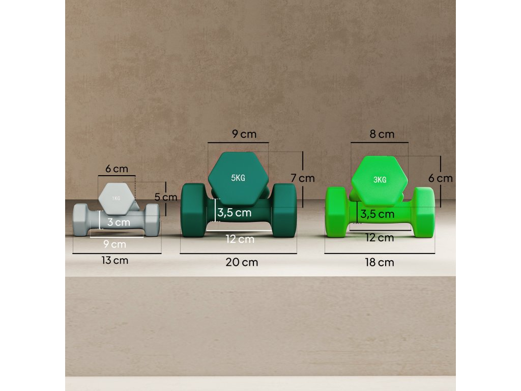 ✔ Rozměry činky: (1 kg) 13D x 6Š x 6V cm, (3 kg) 18D x 8Š x 8V cm, (5 kg) 20D x 9Š x 9V cm