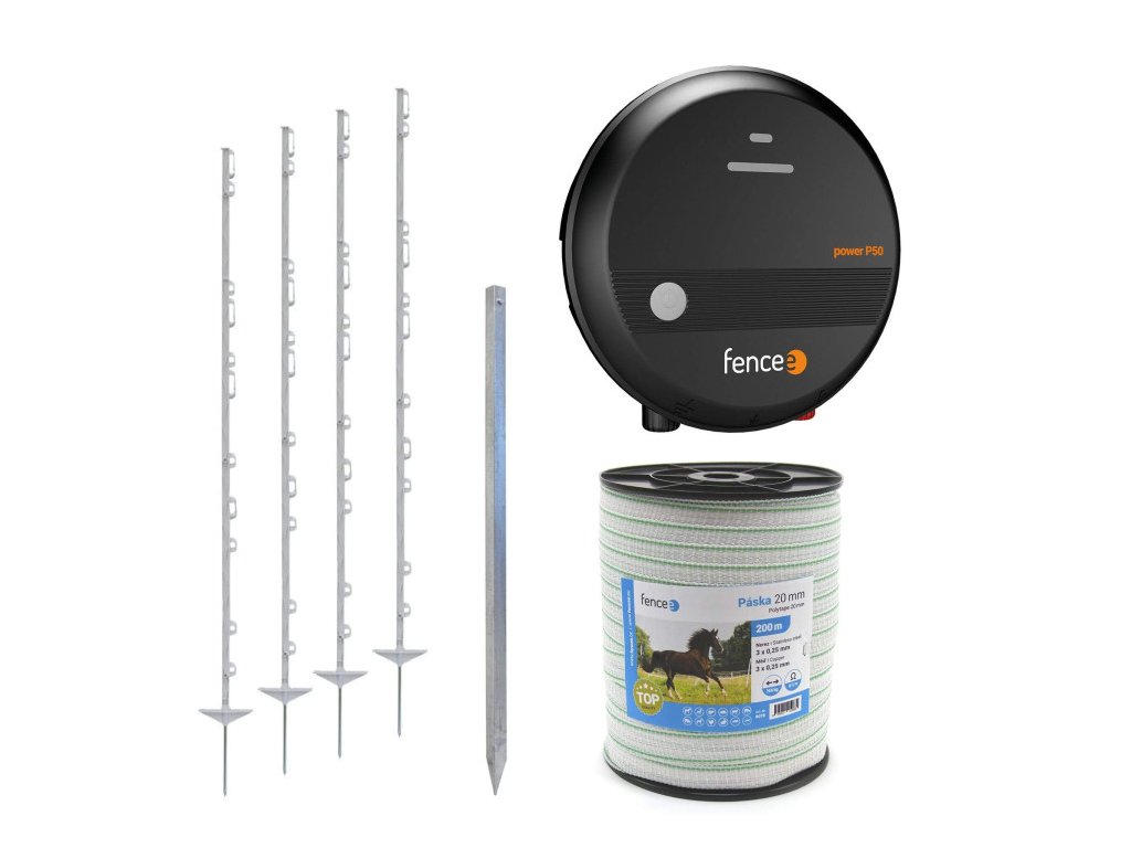 Základem sady je bezúdržbový síťový generátor elektrického ohradníku fencee power P50. Ohradníkový zdroj s výkonem 5 J vhodný pro ohrady s délkou instalace až 47 km. Síťový zdroj stačí zapojit do zásuvky 230 V pomocí napájecího kabelu a zapnout ON/OFF tlačítkem.