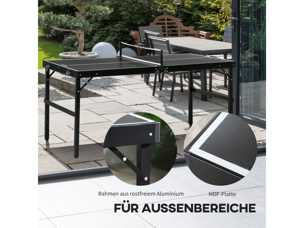 - Robustní venkovní materiál: Stůl na stolní tenis je vyroben z MDF a je podepřen lehkou hliníkovou konstrukcí, která umožňuje hladké a plynulé hraní. Gumové podložky pod nohama zajišťují rovnou hrací plochu. Všechny materiály jsou odolné proti vodě, korozi a rzi, což je ideální pro venkovní použití.