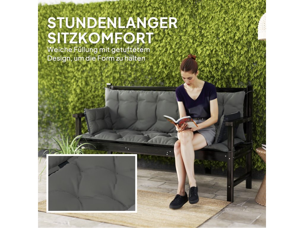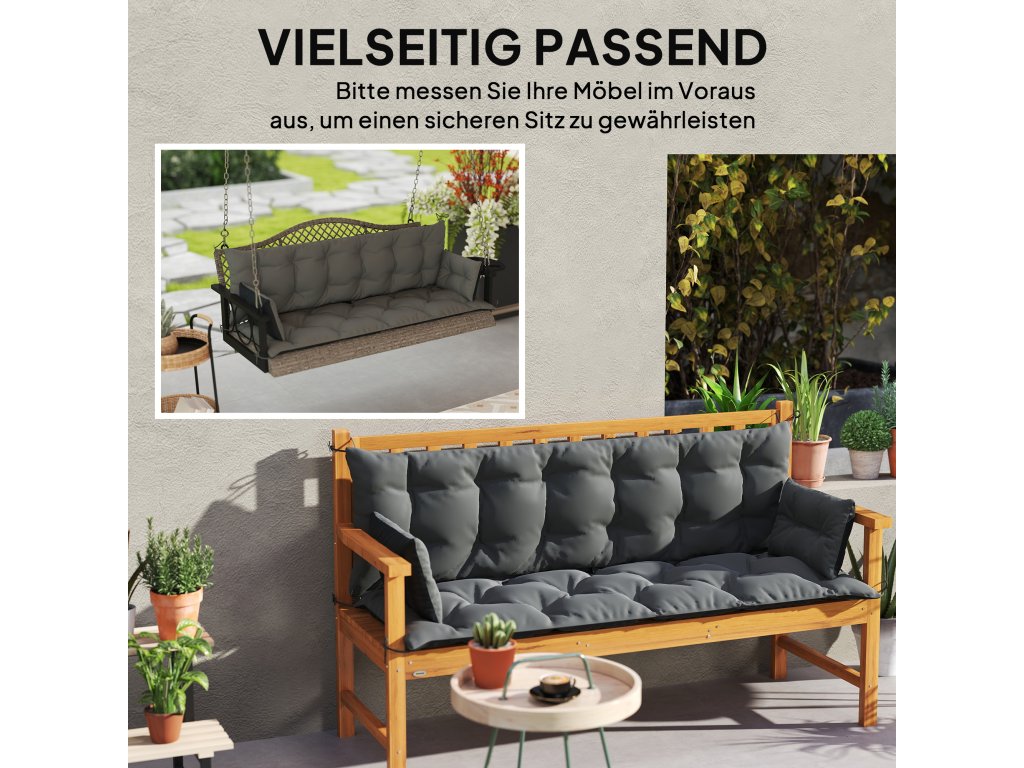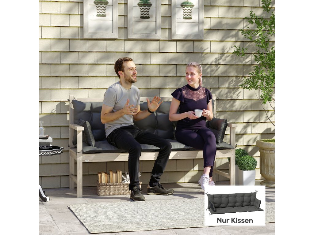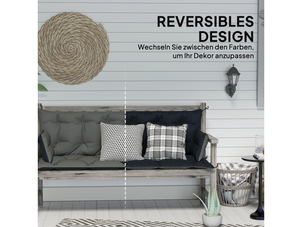 Optimalizujte svůj venkovní prostor pomocí polštáře Outsunny pro zahradní nábytek. Oboustranný design s kontrastními barvami venkovního sedacího polštáře vám umožní vybavit terasu, zahradu nebo balkon různými barvami. Tyto polštáře na zahradní lavice jsou vyrobeny z polyesteru o hmotnosti 230 g/m² a díky technologii všívání si zachovávají svůj tvar. Jsou vodoodpudivé a snadno se udržují, jsou ideální pro trojsedáky, jako jsou pohovky a hollywoodské houpačky, a nabízejí dlouhotrvající stylové pohodlí.