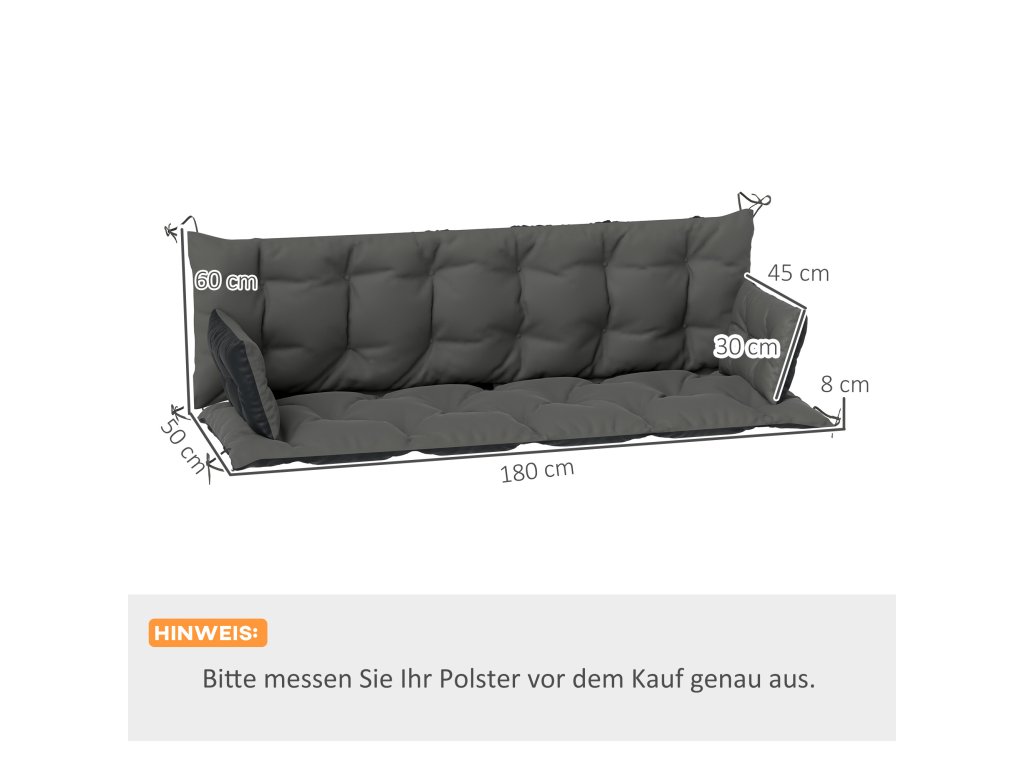Sada venkovních polštářů Outsunny pro lavičku nebo houpačku, dvoubarevná, polyester, pěna, 180 x 110 x 8 cm, tmavě šedá
