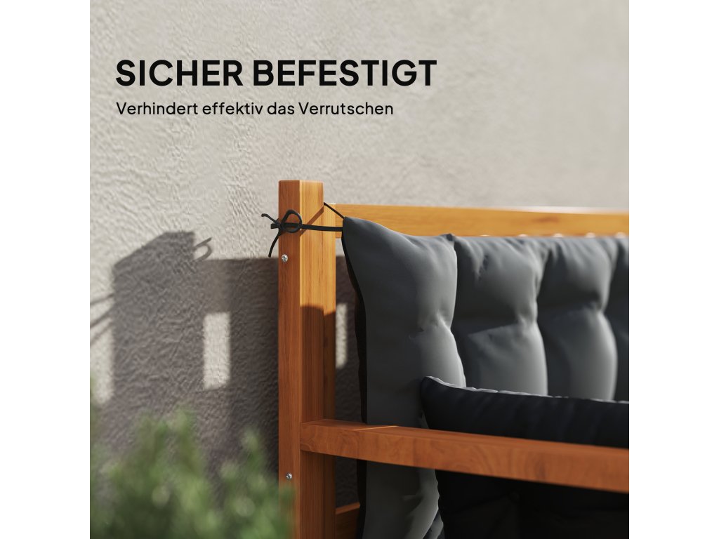 - Bezpečně upevněné: Díky praktickým upevňovacím páskům na obou stranách zůstávají tyto polštáře na zahradní lavičky bezpečně připevněny k nábytku a zabraňují tak jejich sklouznutí nebo odfouknutí při větrném počasí