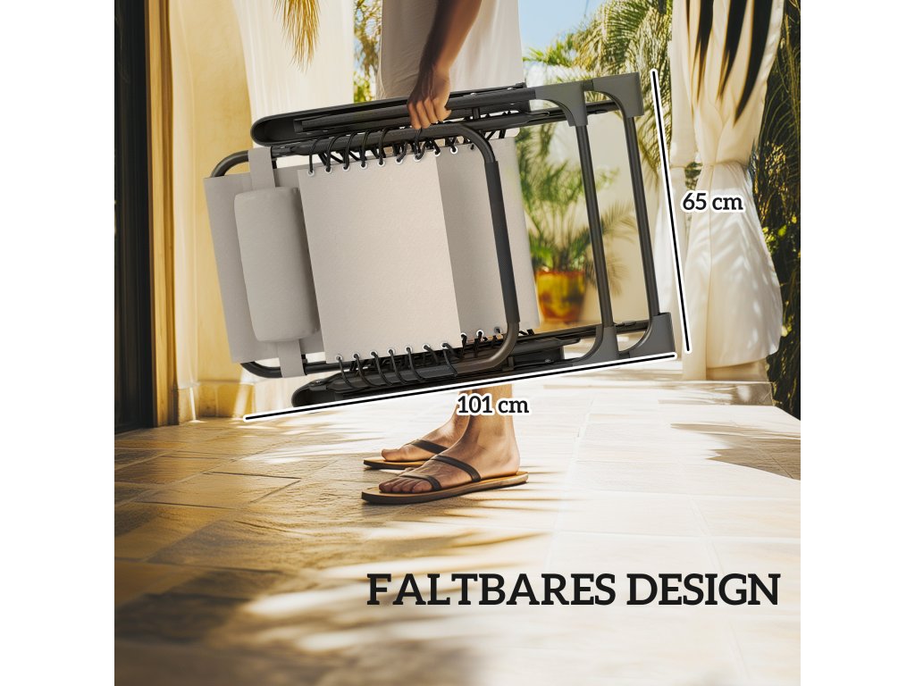 Odpočívejte bez námahy s přítelem díky sadě venkovního stolu a lehátka na terasu od společnosti Outsunny. Nastavitelné opěradlo bazénového lehátka umožňuje dokonalou polohu při ležení. Textilie Textiline balkonového lehátka, kterou drží na místě pevné elastické popruhy, snižuje tlak na tělo a zvyšuje pohodlí. Praktický boční stolek se dvěma integrovanými držáky na nápoje zajistí, že budete mít nápoje vždy na dosah. Lehátko je ideální pro nezapomenutelné hodiny strávené venku a spojuje v sobě pohodlí, funkčnost a styl.