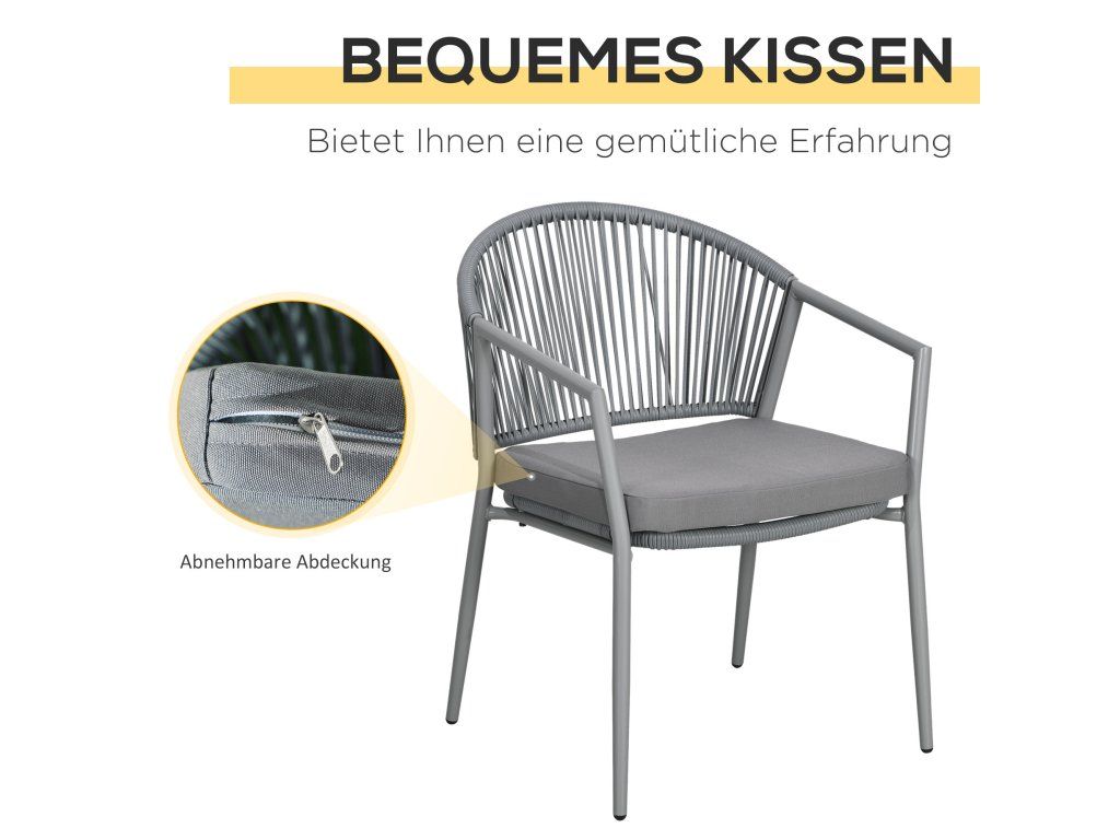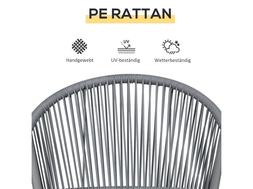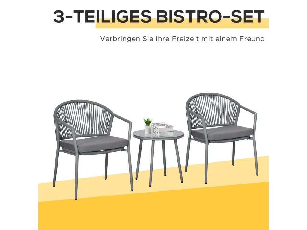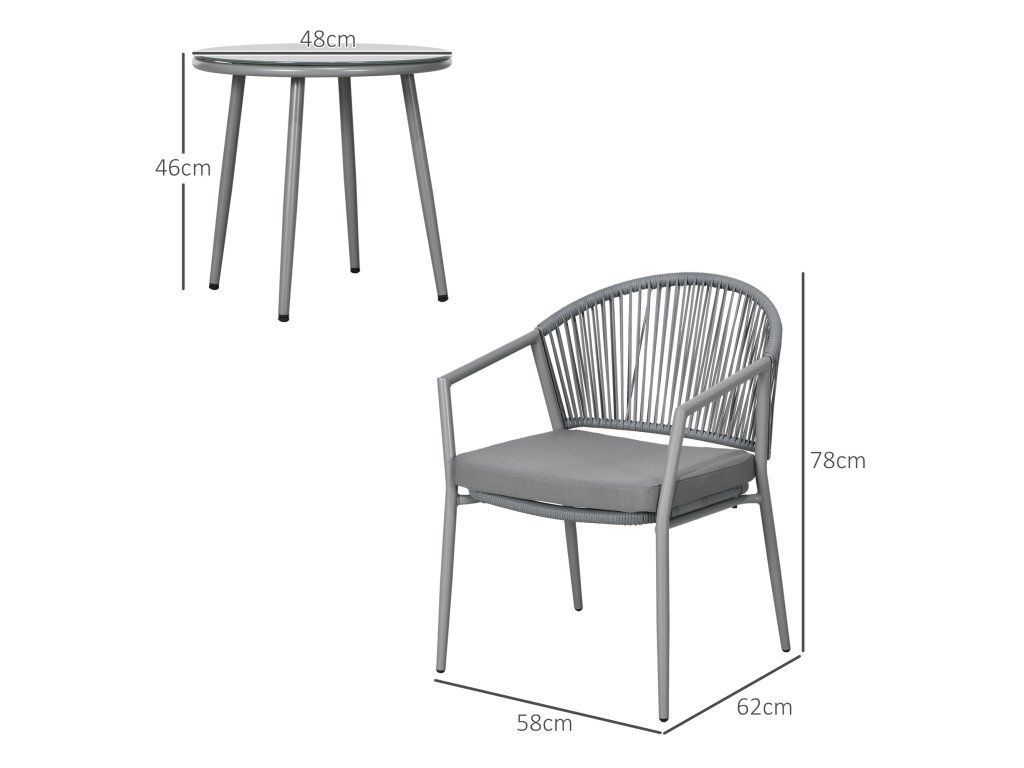 Sada zahradního nábytku Outsunny, 2 židle a 1 stůl se skleněnou deskou, ratanový vzhled, odolný proti povětrnostním vlivům, kovový rám, šedá barva