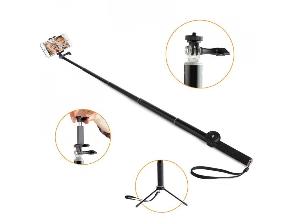 Díky bohatému příslušenství se stává selfie tyč univerzálním cestovním fotografickým příslušenstvím. Upevníte na ni samozřejmě telefon libovolné úhlopříčky, dále klasický fotoaparát se stativovým závitem nebo outdoorovou kameru. Tyč je vybavena držáky pro všechna tato zařízení. Navíc je balení doplněno o tripod - variabilní stojánek se stativovým závitem. Ten využijete především pro focení klasickým foťákem na nerovných terénech se samospouští, ale díky stativovému závitu na něj snadno našroubujete i celou selfie tyč s různými koncovkami.