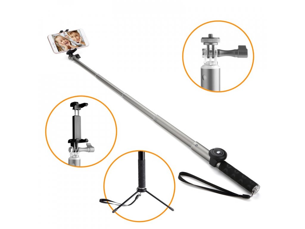 Díky bohatému příslušenství se stává selfie tyč univerzálním cestovním fotografickým příslušenstvím. Upevníte na ni samozřejmě telefon libovolné úhlopříčky, dále klasický fotoaparát se stativovým závitem nebo outdoorovou kameru. Tyč je vybavena držáky pro všechna tato zařízení. Navíc je balení doplněno o tripod - variabilní stojánek se stativovým závitem. Ten využijete především pro focení klasickým foťákem na nerovných terénech se samospouští, ale díky stativovému závitu na něj snadno našroubujete i celou selfie tyč s různými koncovkami.