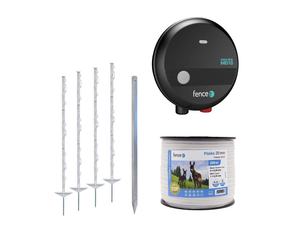 Set elektrického ohradníku je praktickým a mobilním řešením s jednoduchou instalací. Kompletní sada ohradníku s kvalitní bílou vodivou páskou 200 m a plastovými sloupky 105 cm (86 cm nad zemí) vhodná pro citlivější zvířata a koně. Ohradník lze využít také k ochraně pozemků, chovných jezírek, zahradních rybníčků, králíkáren a kurníků před škůdci a predátory – vydra, kuna, kočka, volavka a liška. Kombinovaný 230 V/12 V zdroj ohradníku mini DUO MD10, který lze použít jako bateriový ohradník má nízkou spotřebou a možnost přepnutí do úsporného režimu. Generátor lze použít pro ohrady dlouhé až 9 km.Set elektrického ohradníku s kompletním vybavením k instalaci malé ohrady pro koně a jejich mláďata. Lze využít také k vymezení prostoru na zahradách pro psy. Ohradníkovou sadu můžete využít pro ochranu zahrad, polí, králíkáren před škůdci a malými predátory, kterými mohou být srnky, zajíci, lesní zvěř, lišky. Elektrický ohradník je efektivním řešením v boji proti škůdcům, kteří ničí vaše záhonky a úrodu.