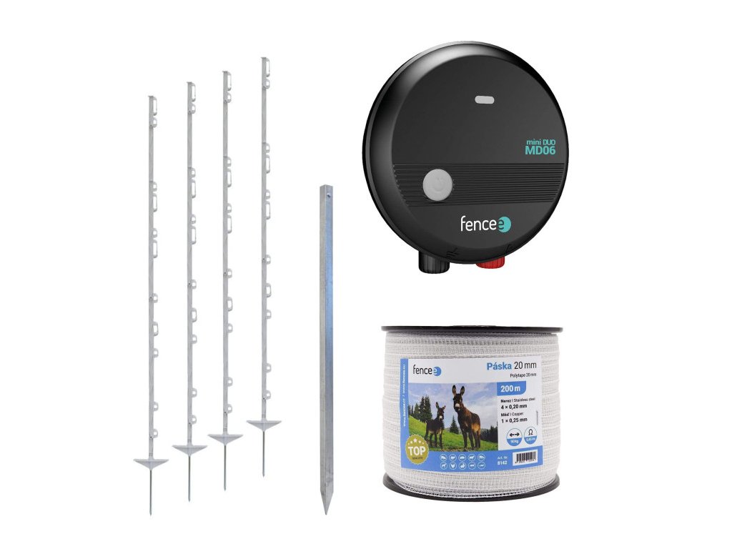 Set elektrického ohradníku s kompletním vybavením pro instalaci malé ohrady pro koně. Ohradníkový set s vodivou páskou a vysokými plastovými sloupky vhodný hlavně pro koně a jejich mláďata. Ohradníková sada lze použít také pro vymezení prostoru pro volný pohyb větších psů na zahradách a dvorech. Lehký přenosný generátor s výstupním výkonem 0,6 J dokáže napájet ohradu dlouhou až 7 km. Bíle plastové sloupky 156 cm mají 11 oček pro provléknutí vodiče v několika úrovních. V balení najdete také kvalitní vodivou pásku s měděným drátkem pro lepší vodivost.Malý generátor ohradníku fencee mini DUO MD06 s kombinovaným napájením 230 V/ 12V je ideální volbou pro mobilní elektrické ohrady a padoky s koňmi. Nová funkce Power Save (úsporný režim) šetří energii připojené baterie. Po přepnutí do úsporného režimu se přibližně dvojnásobně prodlouží interval mezi elektrickými impulsy. Plně nabitá baterie pak vydrží napájet ohradník 50 až 55 dnů.