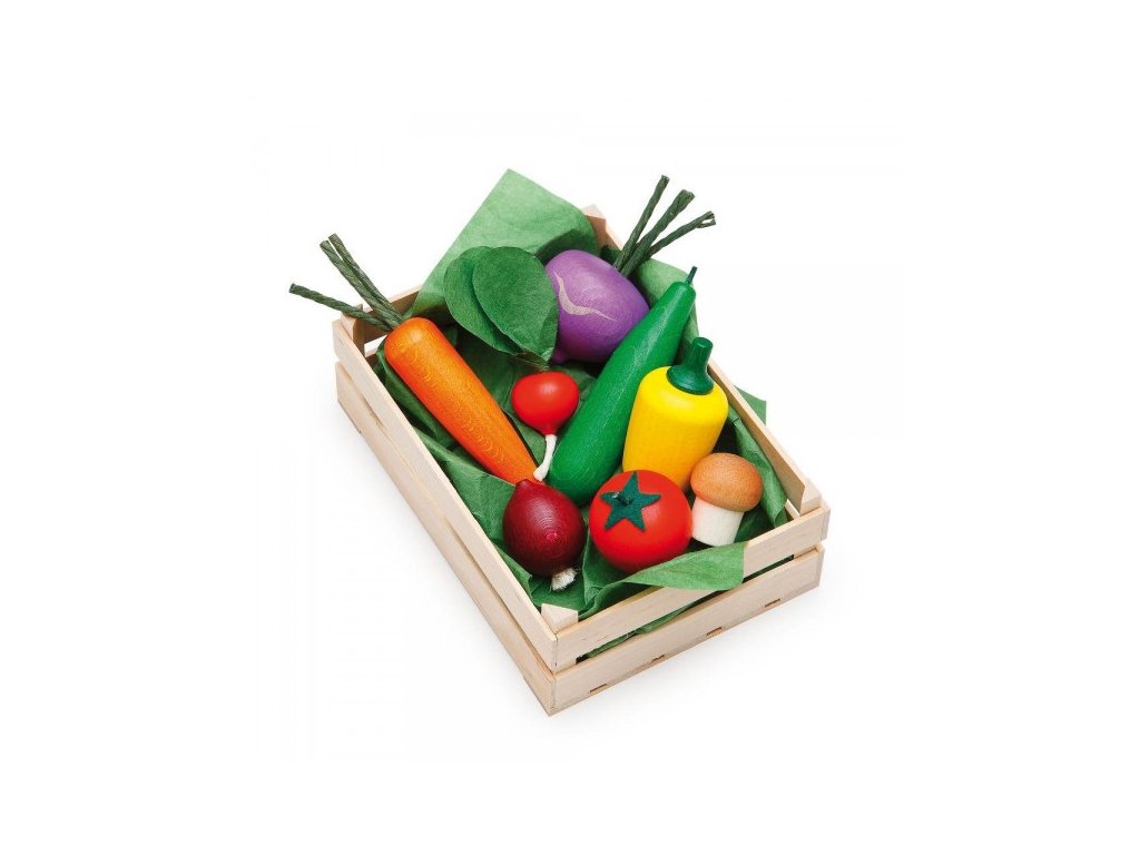 8 ks zeleniny z bukového dřeva v dřevěné přepravce.Rozměry (d x š x v) cm / hmotnost: 17 x 12,4 x 6 / 260 g. Určeno pro věk: 3+.
