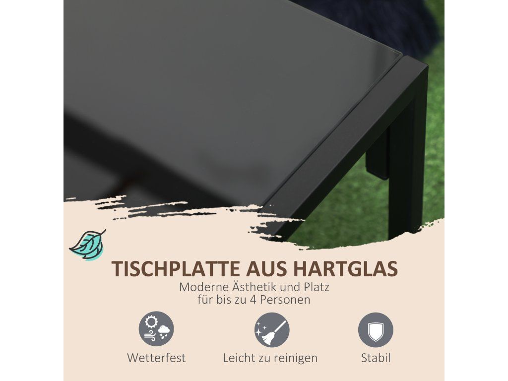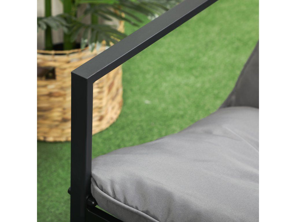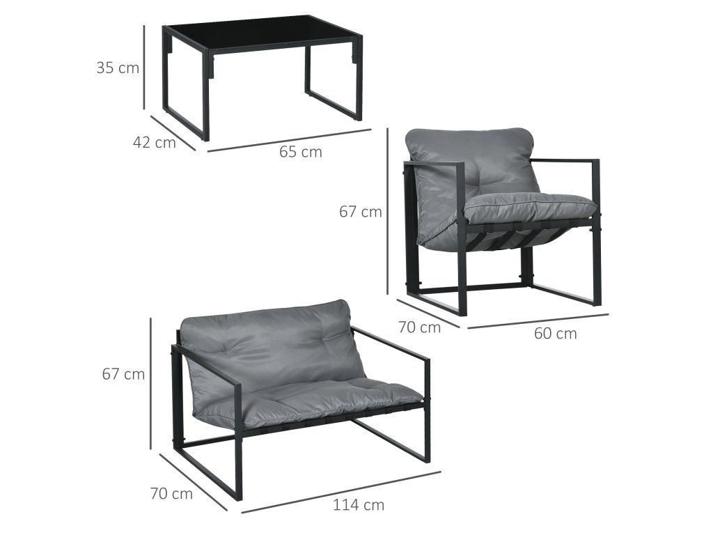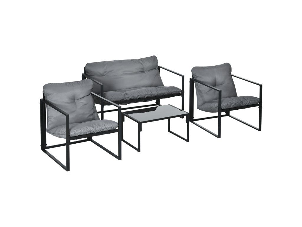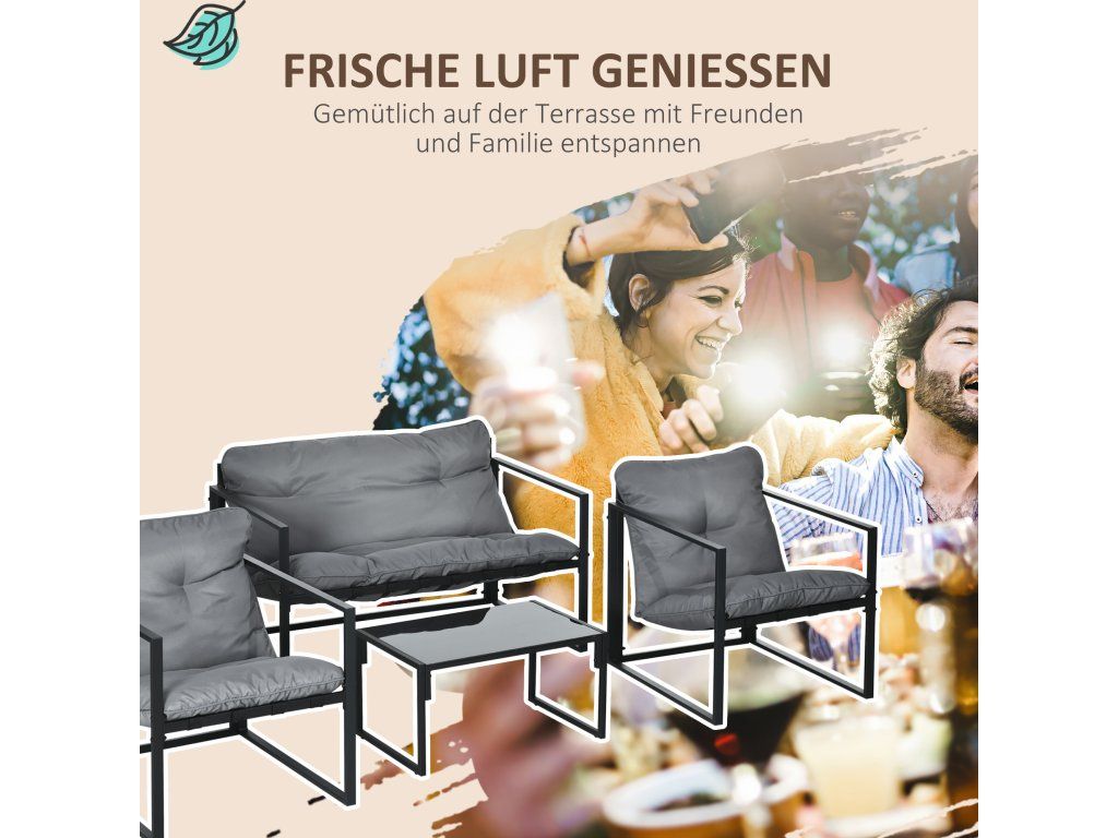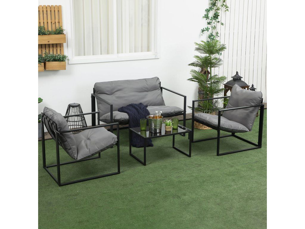 S touto moderní sadou zahradního nábytku od Outsunny můžete shromáždit přátele a rodinu pod širým nebem. Sedací část se skládá ze čtyř částí - dvou křesel, dvoumístné pohovky a jídelního stolu. Robustní, stabilní a povětrnostním vlivům odolná kovová konstrukce a silně polstrované polštáře na sedadlech a opěradlech nabízejí mnoho pohodlí při sezení. Stůl je vyroben z tvrzeného skla a má ochranné podložky na nohách, které zajišťují dobrou rovnováhu.