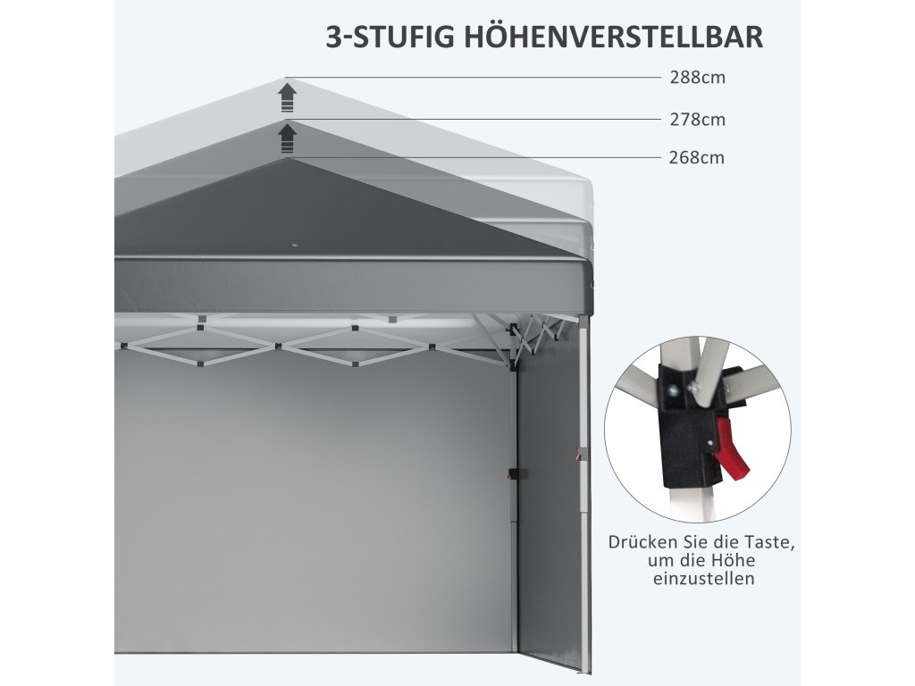 - Nastavitelná výška: Stisknutím tlačítka nastavíte výšku skládacího altánu tak, aby vyhovovala dané příležitosti. Můžete si vybrat ze tří výškových nastavení: 288, 278 a 268 cm