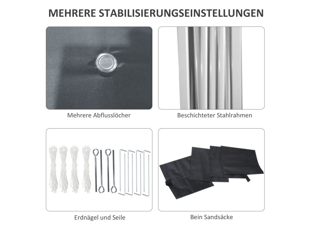 - Pevný stojan: Se zemními kolíky, napínacími lany a čtyřmi pytli s pískem pro bezpečné upevnění altánu. Několik odtokových otvorů zabraňuje hromadění vody na horní straně. Ocelový rám s povrchovou úpravou navíc nabízí vysokou stabilitu