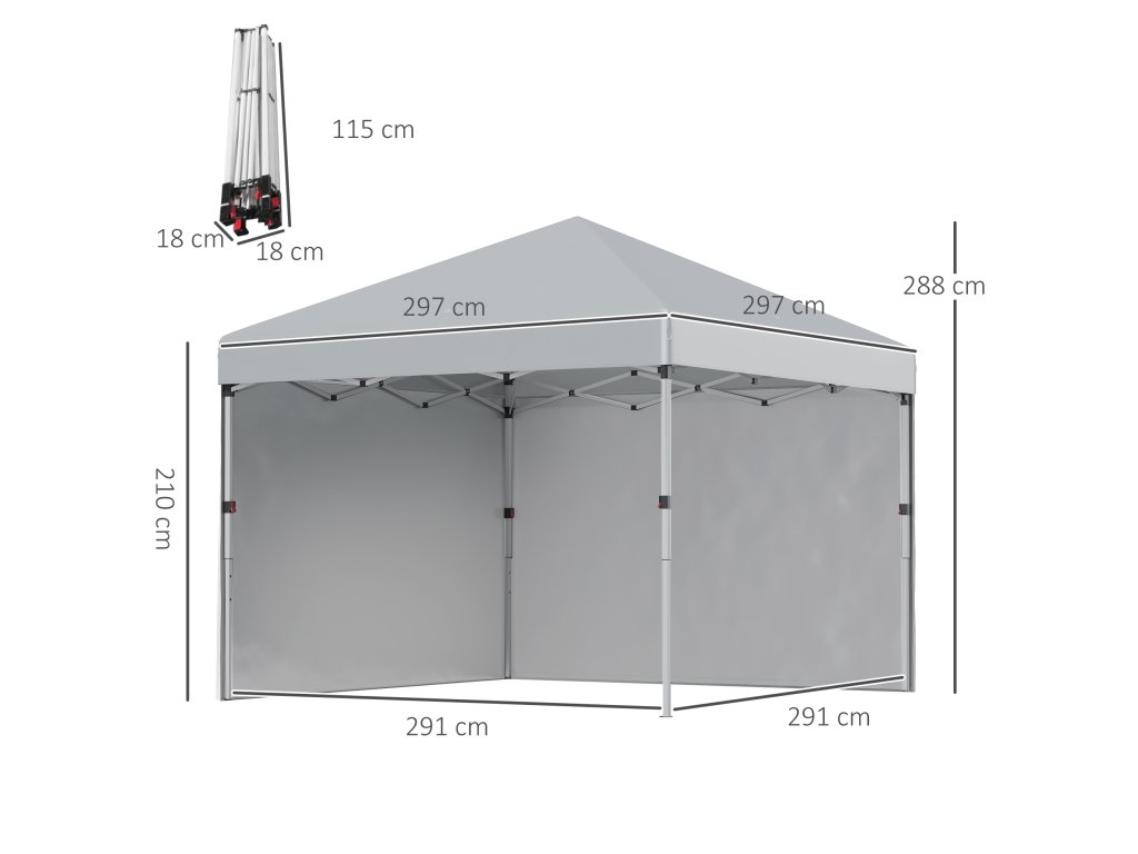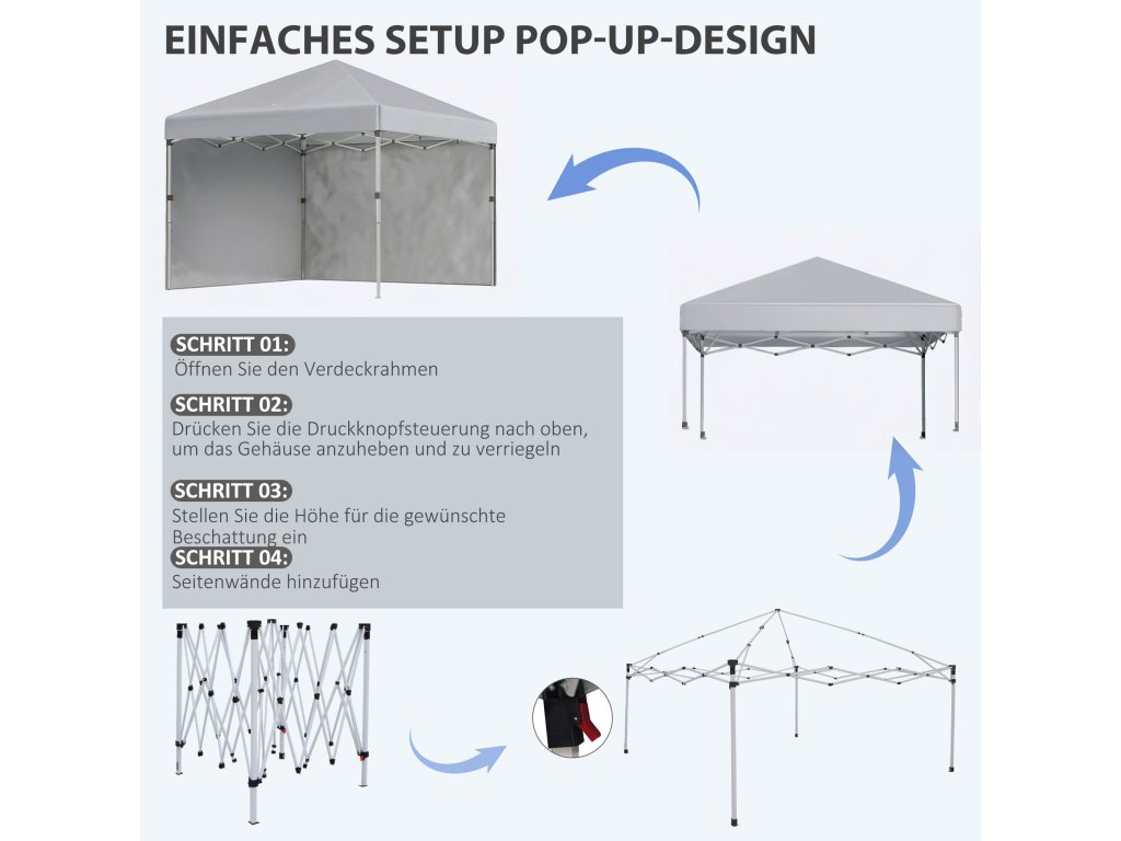 - Nastavitelná výška: Stisknutím tlačítka nastavíte výšku skládacího altánu tak, aby vyhovovala dané příležitosti. Můžete si vybrat ze tří výškových nastavení: 288, 278 a 268 cm