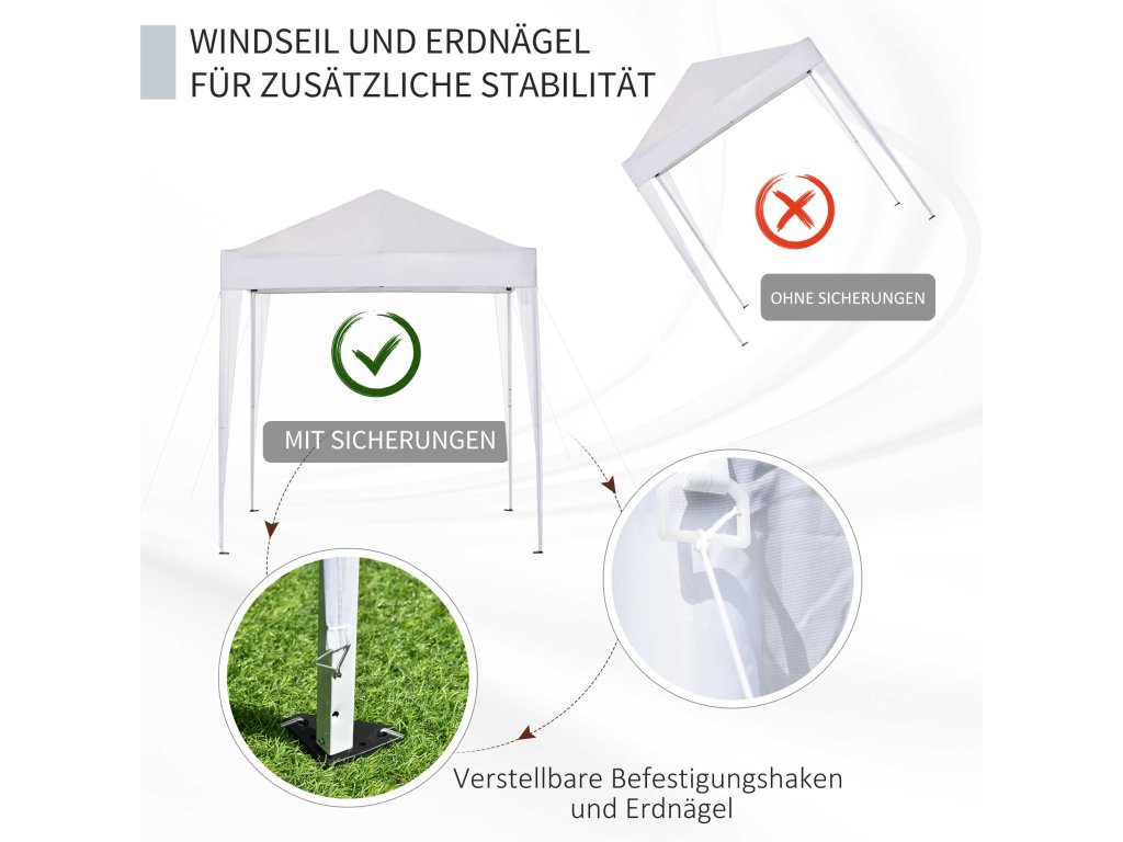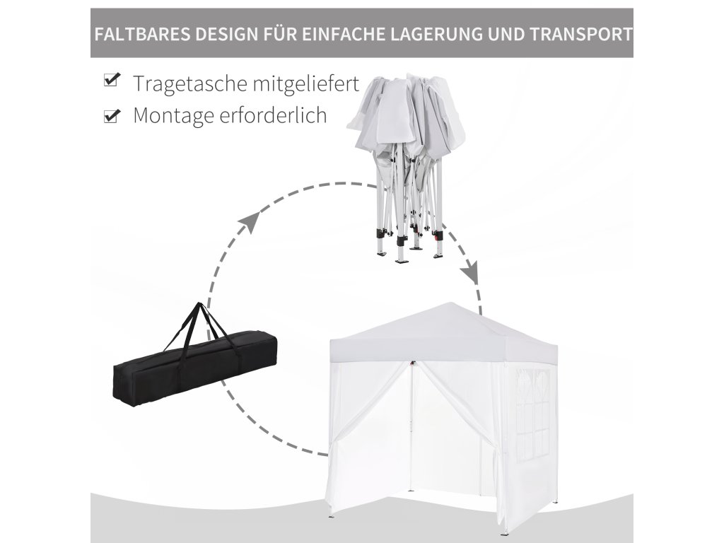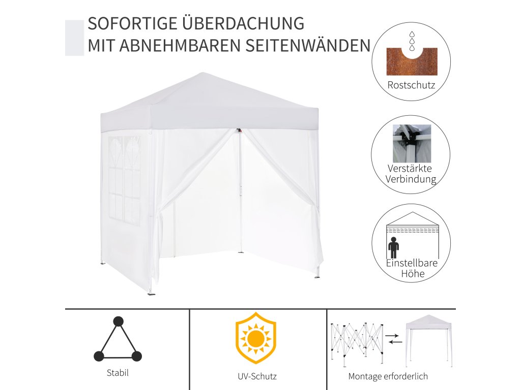- Rychle postavitelná ochrana proti slunci: snadno přenosný a postavitelný pavilon (2 x 2 m) se 4 odnímatelnými stěnami pro různé venkovní akce