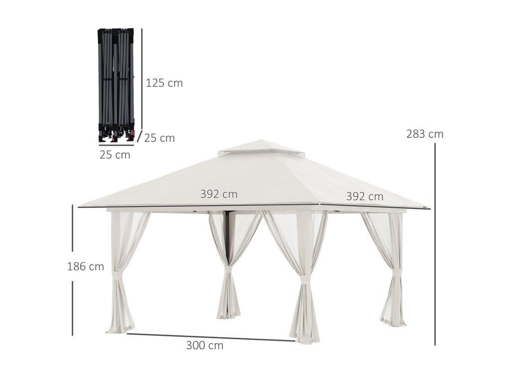 - Celkové rozměry párty stanu: 392L x 392B x 283V cm. Rozměry při složení: 25L x 25W x 125H cm. NIKDY nenechávejte altán bez dozoru. V případě nepříznivého počasí je nutné altán demontovat. K zajištění altánu vždy používejte dodané kolíky i dodaná napínací lana