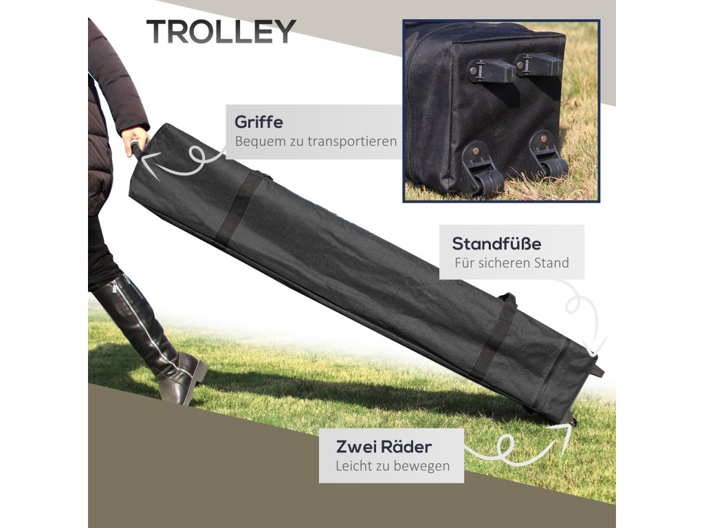 - Kompaktní a rychlé sestavení: Zvedněte střechu pavilonu, přetáhněte látku přes rám, rozložte nohy a můžete vyrazit! Díky skládacímu kovovému rámu se snadno a pohodlně přepravuje a ukládá do úložné tašky s kolečky