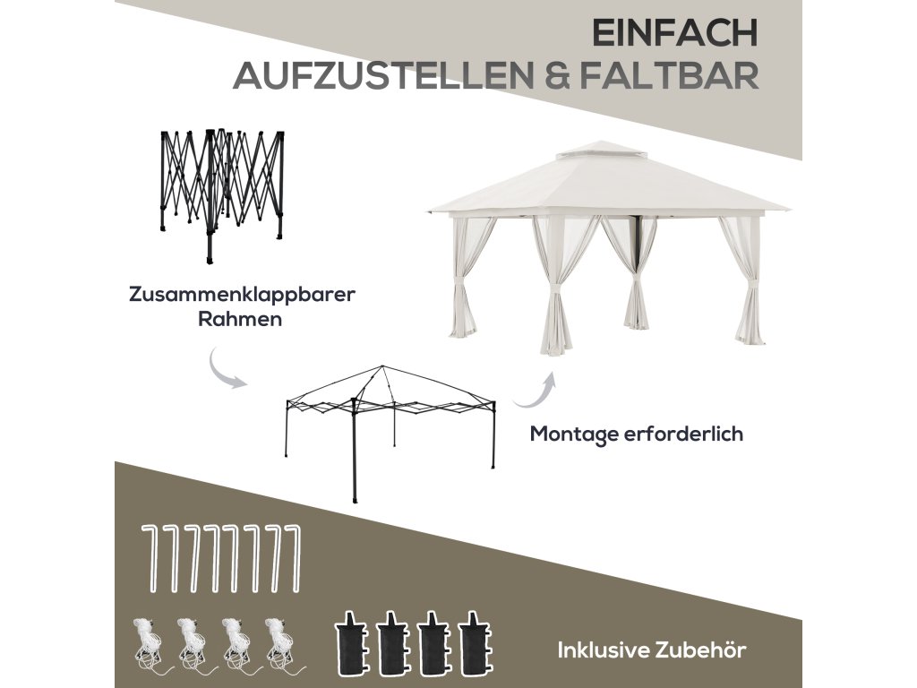 - ✔ Skládací konstrukce altánu umožňuje montáž a demontáž během několika minut