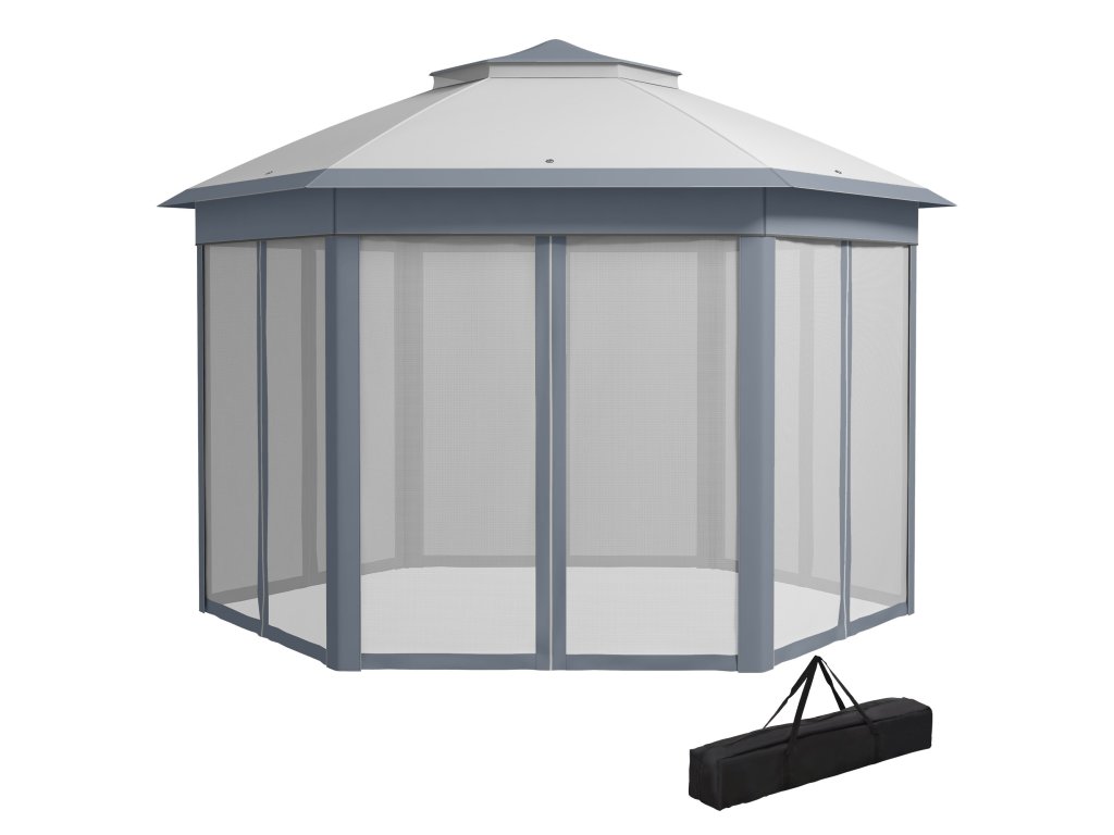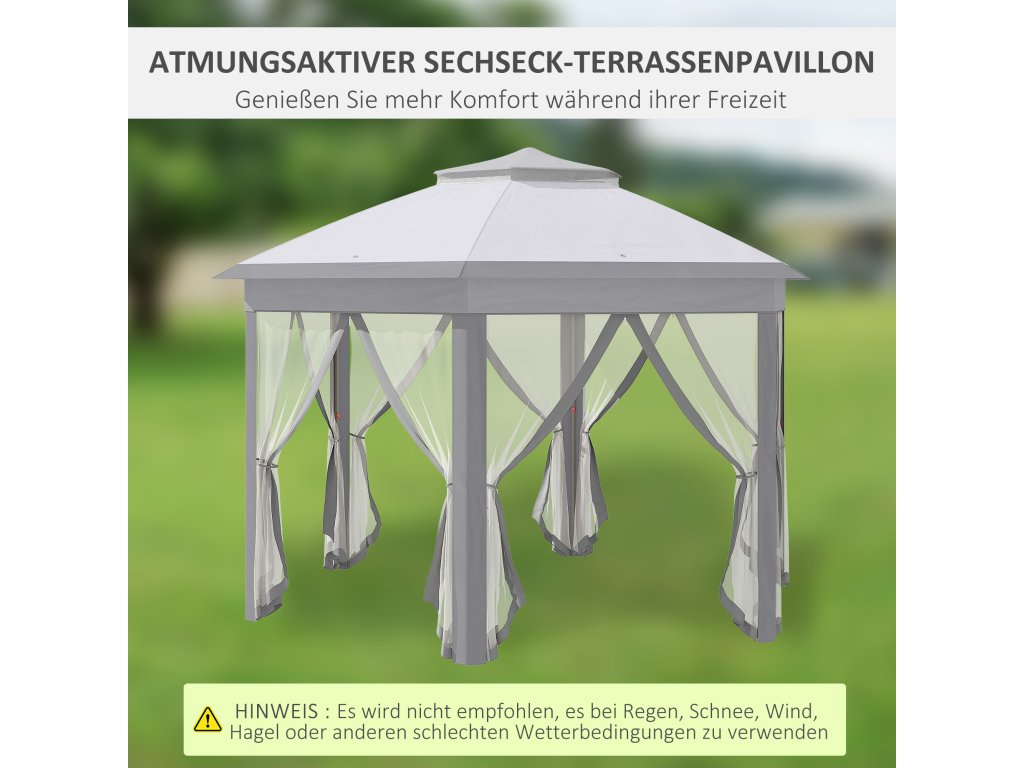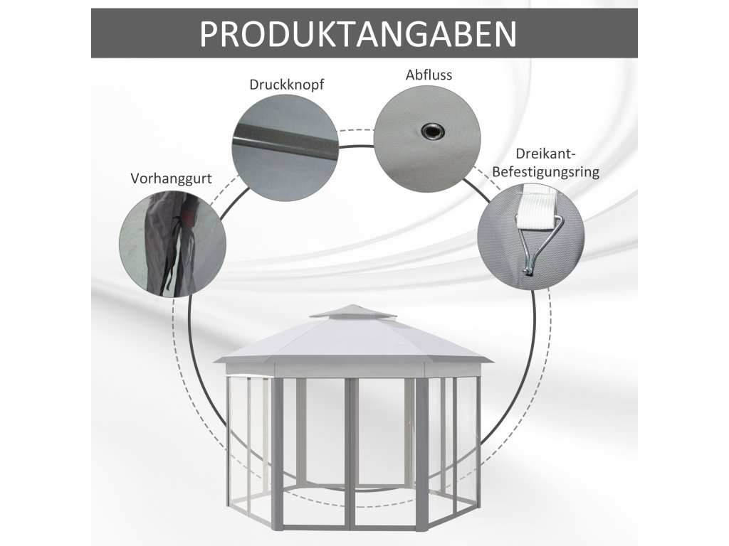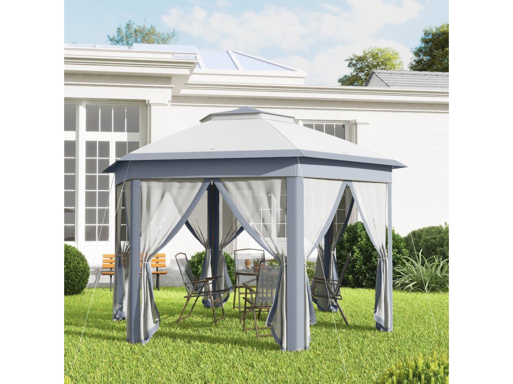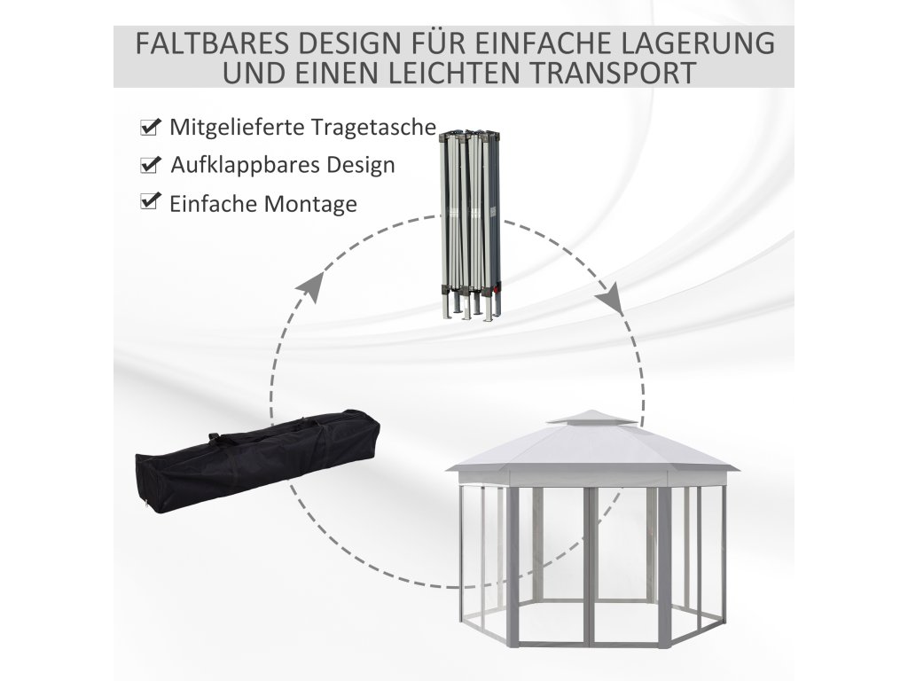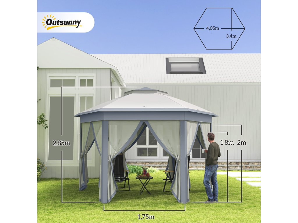 Skládací altán Outsunny 4 x 4 m, šestiúhelníkový design, síťové závěsy, vodoodpudivý, odvětrávaná střecha, šedá+bílá