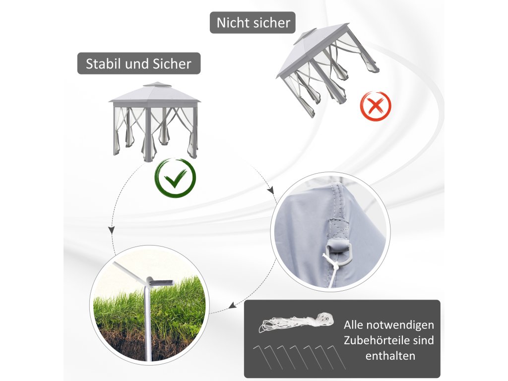 - Jednoduchá montáž: Atraktivní šestihranný design, rychlá montáž šetří čas a námahu. Tento pop-up altán s bočními stěnami je ideální pro grilování, letní párty a další venkovní akce