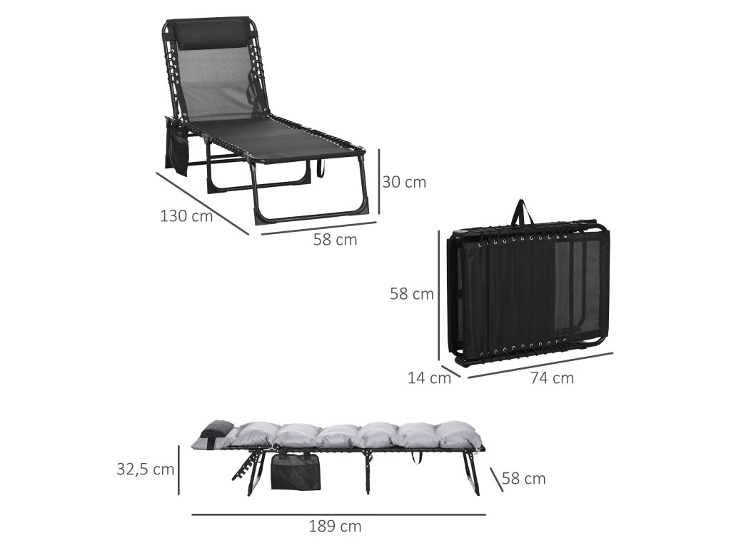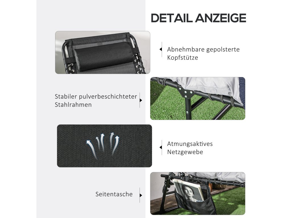 S tímto lehátkem Outsunny můžete spojit pobyt venku s absolutní relaxací. Díky robustnímu kovovému rámu a prodyšnému síťovanému potahu sedáku a opěradla, stejně jako měkkému polstrování sedáku a opěrky hlavy, vám bude na tomto lehátku neuvěřitelně pohodlně. Lehátko snadno unese hmotnost až 120 kg a má opěradlo, které lze nastavit v pěti stupních, takže si můžete kdykoli nastavit svou oblíbenou polohu.