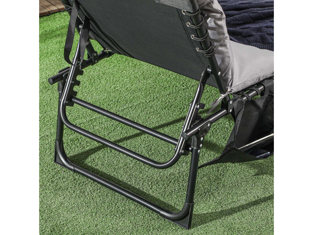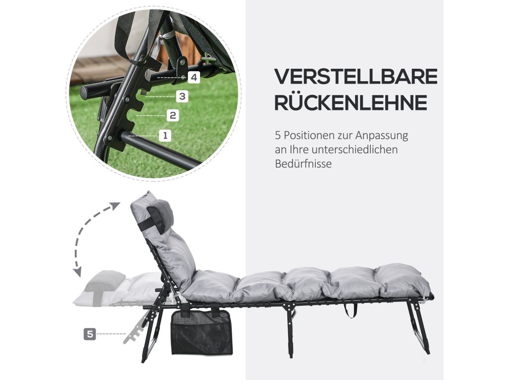 - Nastavitelná opěrka zad: Opěrku zad lze nastavit do 5 poloh a lze ji zcela sklopit o 180°. Ať už si čtete knihu, opalujete se nebo si dáváte šlofíka, můžete si opěradlo snadno nastavit do správné polohy a užívat si zaslouženého odpočinku.