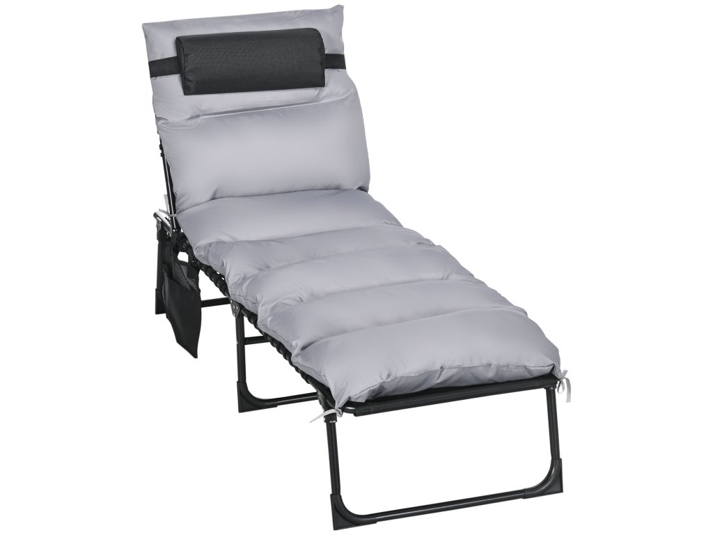 Skládací lehátko Outsunny, 5stupňové polohování opěradla, polštář, podpěra, do 120 kg, ocel, světle šedá, 58 x 189 x 32,5 cm