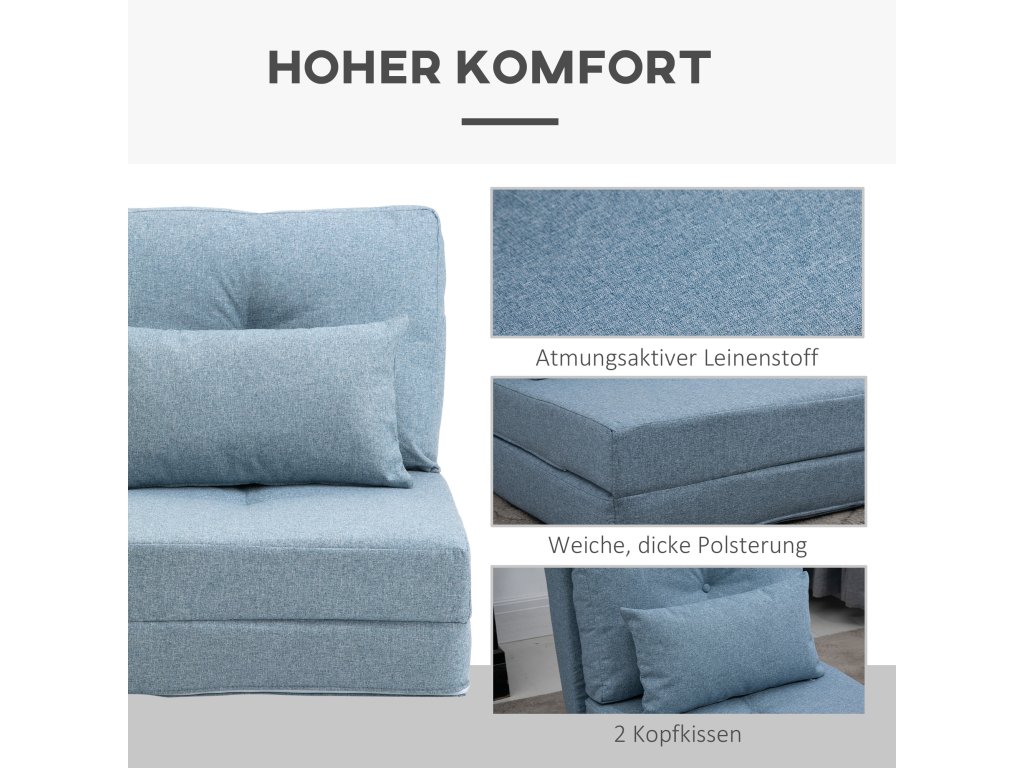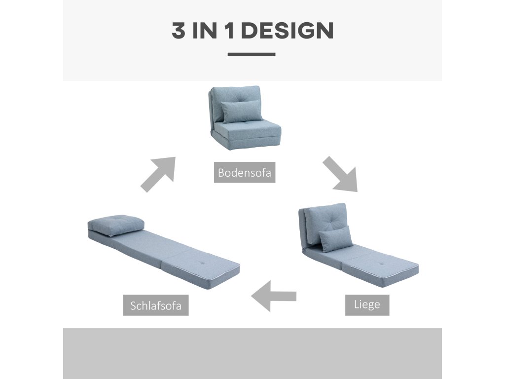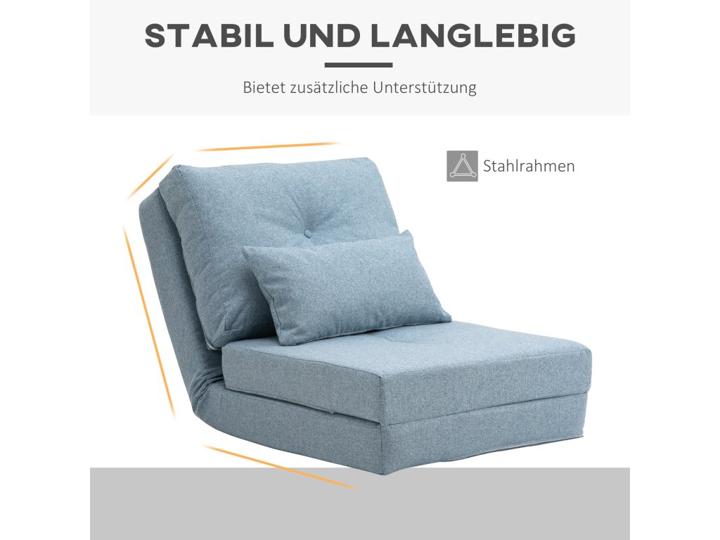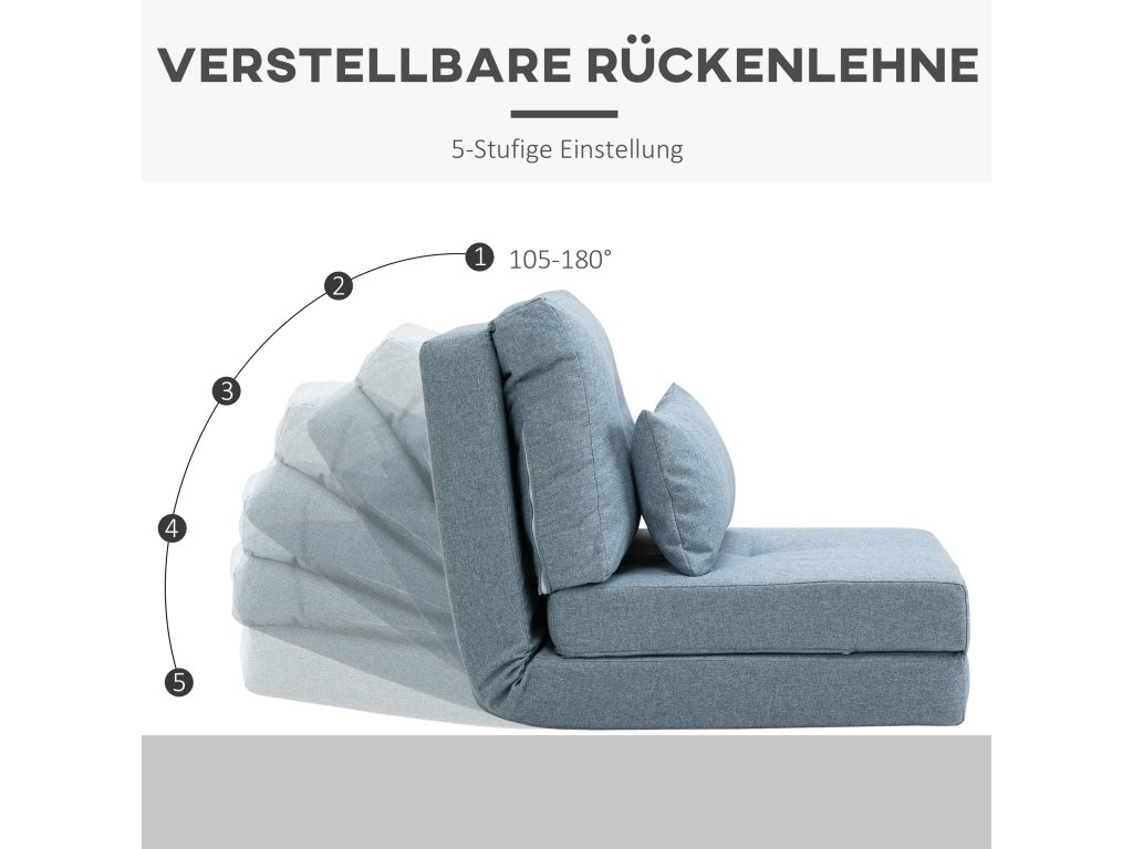 S touto podlahovou pohovkou od společnosti HOMCOM už nikdy nebude sezení na podlaze nepohodlné. Podlahové křeslo s trubkovým kovovým rámem nabízí bezpečnou oporu a je vybaveno snadno udržovatelným lněným potahem a silným polstrováním, takže můžete pohodlně sedět celé hodiny. Pohovku lze nastavit do 5 různých poloh a naklonit až o 180 stupňů. Díky tomu si můžete pohovku přizpůsobit podle svých představ a opěradlo lze v případě potřeby sklopit do podoby pohodlného lůžka.