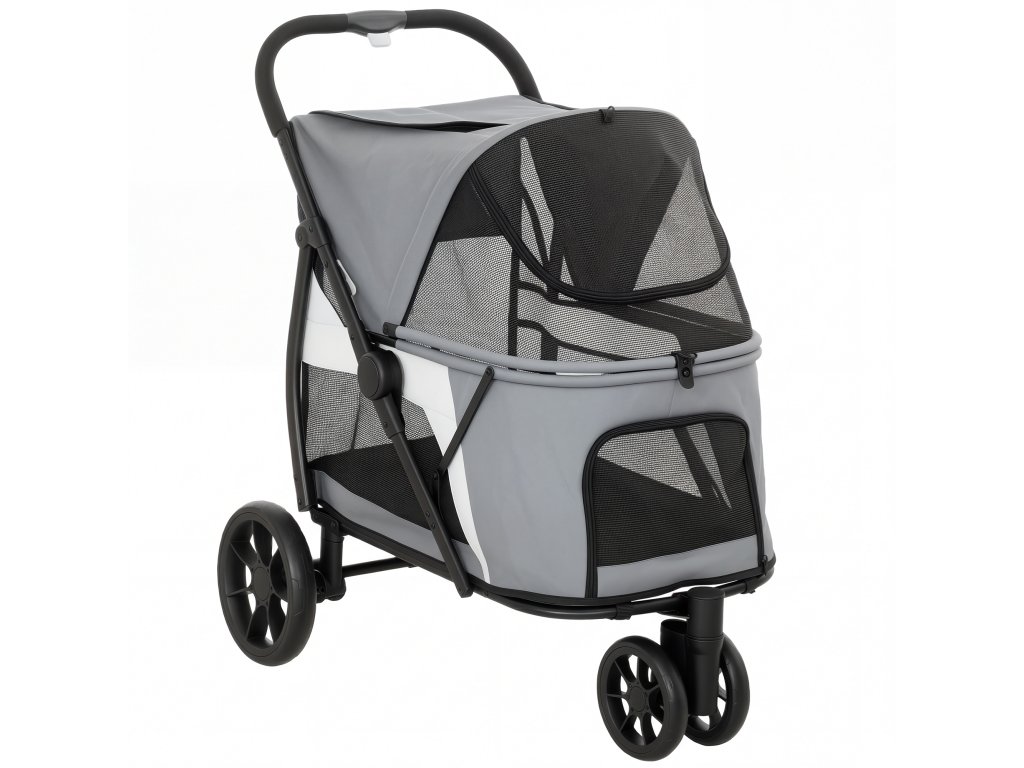 Skládací psí kočárek/kočárek PawHut s pratelným polštářem, síťovaná okénka, 3 kolečka, pro střední psy do 20 kg, šedý