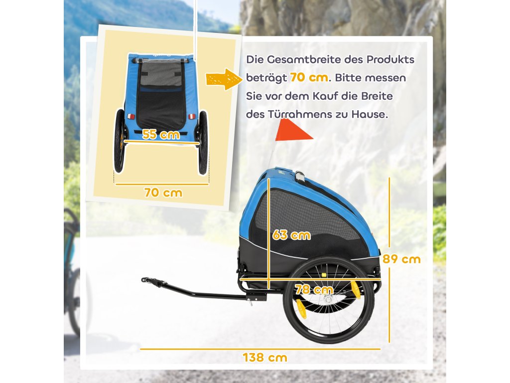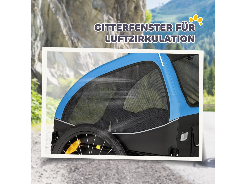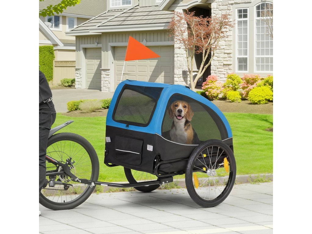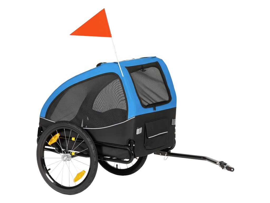 Skládací psí přívěs PawHut s odrazkami, síťovaným okénkem, kolečky, dveřmi a bezpečnostní vlajkou pro psy do 20 kg, 138x70x89 cm, modrý