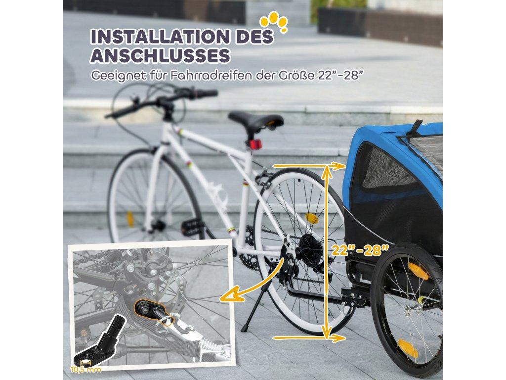 Snadné připojení: Univerzální spojovací mechanismus umožňuje rychlé připojení k jízdnímu kolu se zadním kolem o rozměru 22"-28", takže nastavení je jednoduché a přímočaré. V několika snadných krocích budete připraveni na nová dobrodružství se svým chlupatým společníkem.