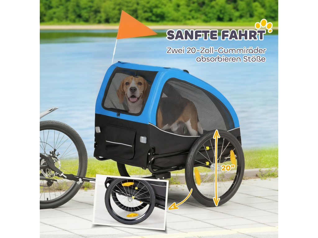 Pohodlí v každém terénu: Dvě 20" gumová kola tohoto přívěsu pro psy účinně tlumí nárazy a zajišťují plynulou a pohodlnou jízdu. Ať už jedete po městských ulicích nebo v parcích, váš mazlíček – zejména starší psi – si užije uvolněnou a pohodlnou cestu.