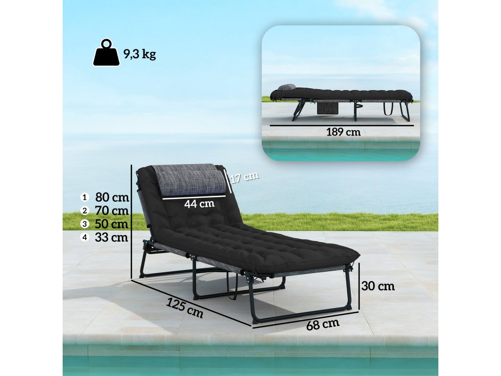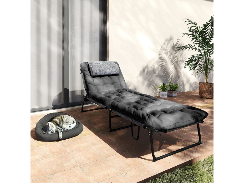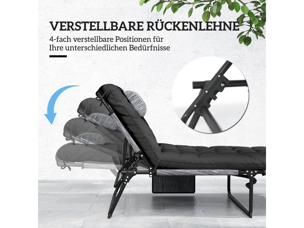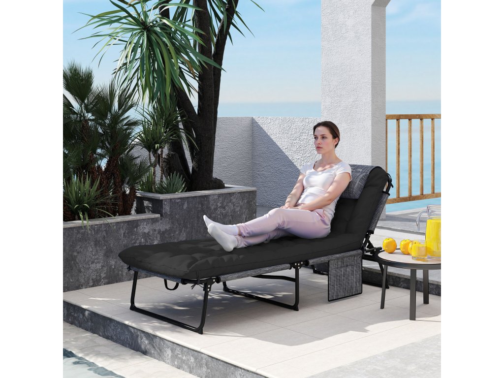 Skládací zahradní lehátko Outsunny s opěrkou hlavy, lehátko s nastavitelnou opěrkou ve 4 polohách a boční kapsou, černé