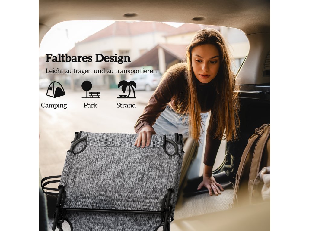 Skládací lehátko: Naše lehátko se rychle složí a má rozměry 67 x 77 x 17 cm, takže ho můžete snadno sbalit do kufru auta a vzít si ho kamkoli – na pláž, do parku nebo na kempování.