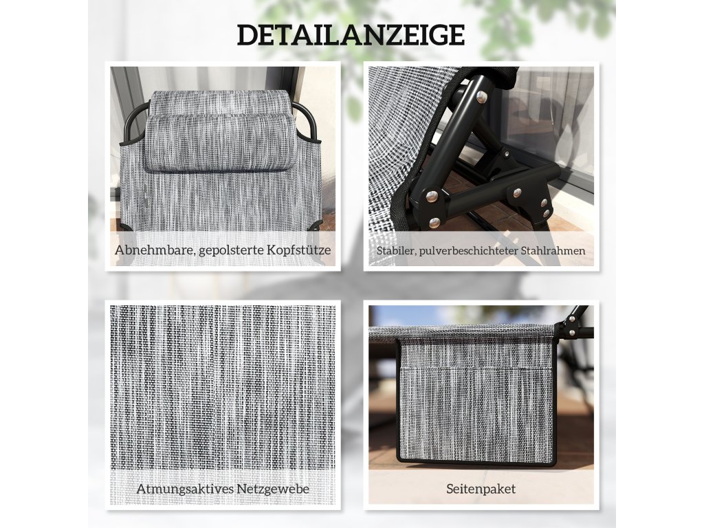 Maximální pohodlí při sezení: Zahradní lehátko s měkkou opěrkou hlavy nabízí útulné sezení, které si můžete přizpůsobit použitím nebo odebráním sedáku. Má také praktickou boční kapsu na váš smartphone, knihu nebo sluneční brýle.
