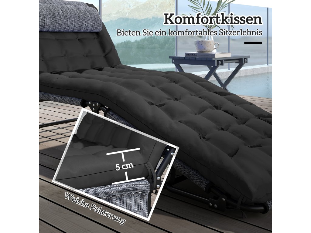Relaxační lehátko: Užijte si skutečnou relaxaci a nádherné letní slunce s tímto skládacím lehátkem. Silný polštář poskytuje bezkonkurenční pohodlí a luxusní zážitek z lenošení. Vezměte si svou oblíbenou knihu a ponořte se do neodolatelně měkkého povrchu, abyste si vychutnali každou linii.