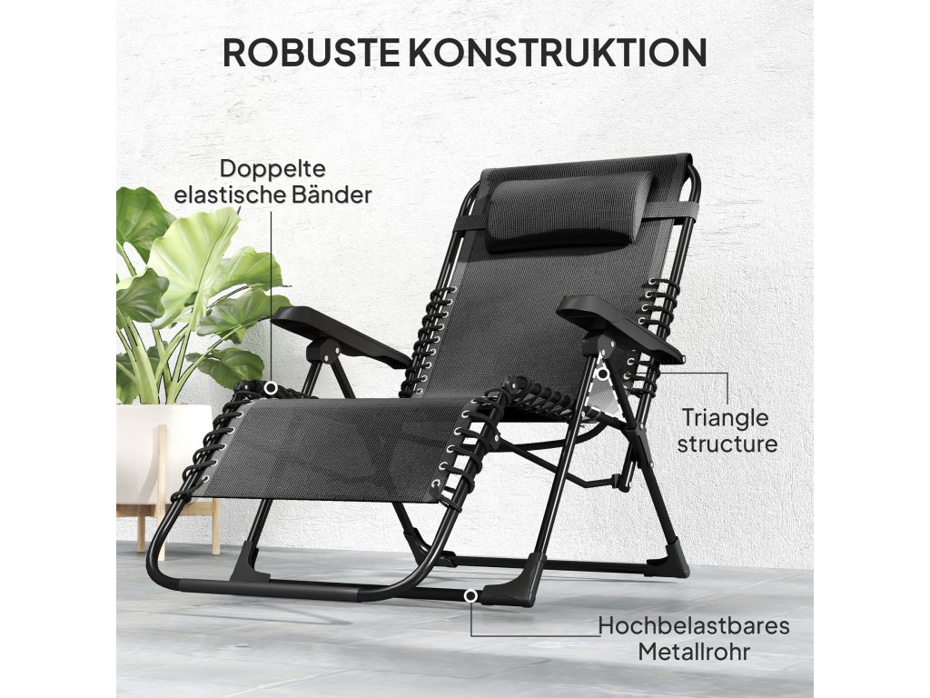 - Kovový rám s nohami ve tvaru písmene "A": Díky robustní kovové konstrukci s práškovým nástřikem a trojúhelníkové základně nabízí toto lehátko s nulovou gravitací vynikající stabilitu a unese až 120 kg pro bezpečnou relaxaci.