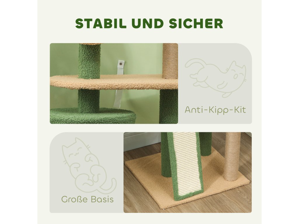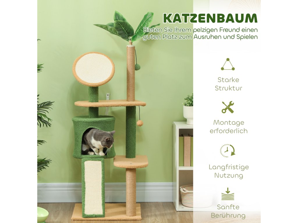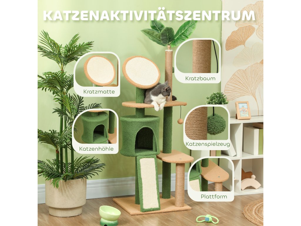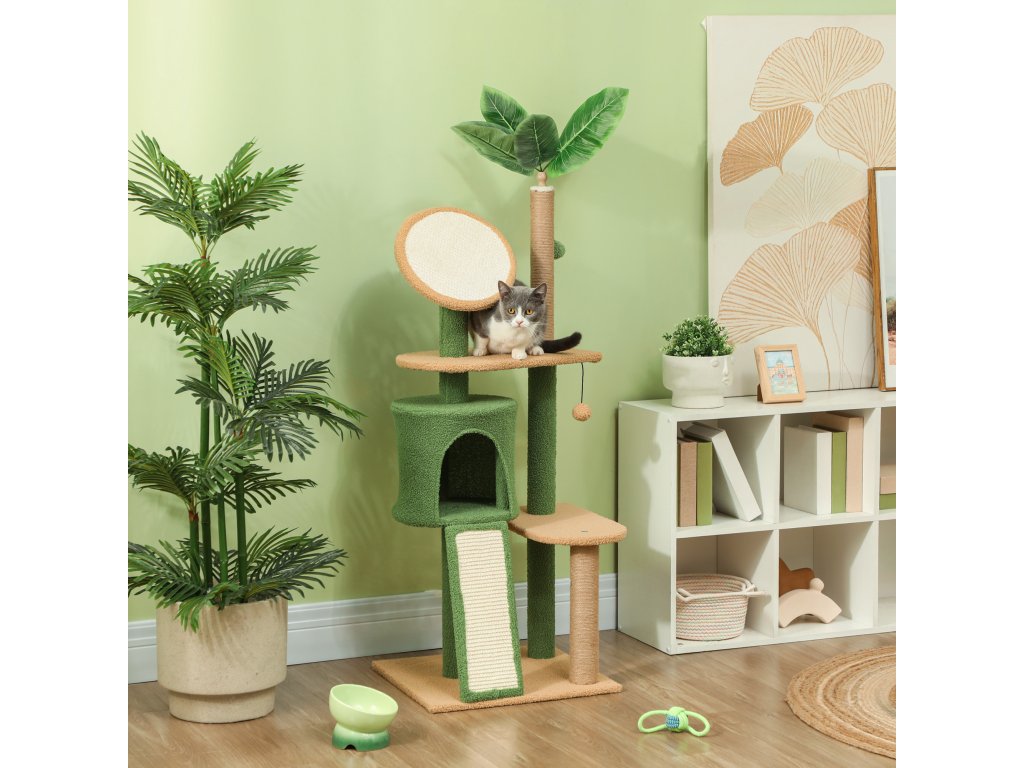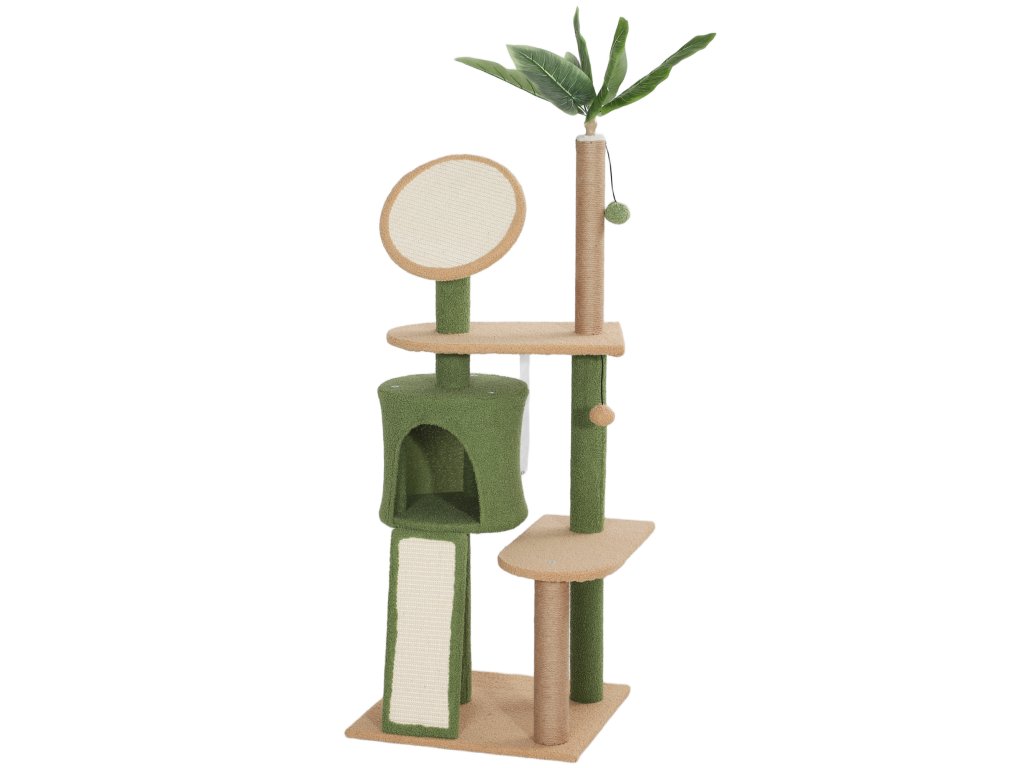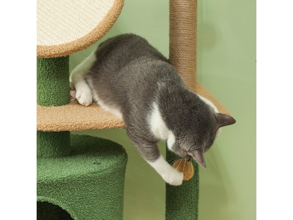 Škrabadlo PawHut, 139 cm dlouhý strom pro kočky s jeskyní, hracími míčky, sisalovými škrabadly a plošinami, pro dvě kočky, zelené