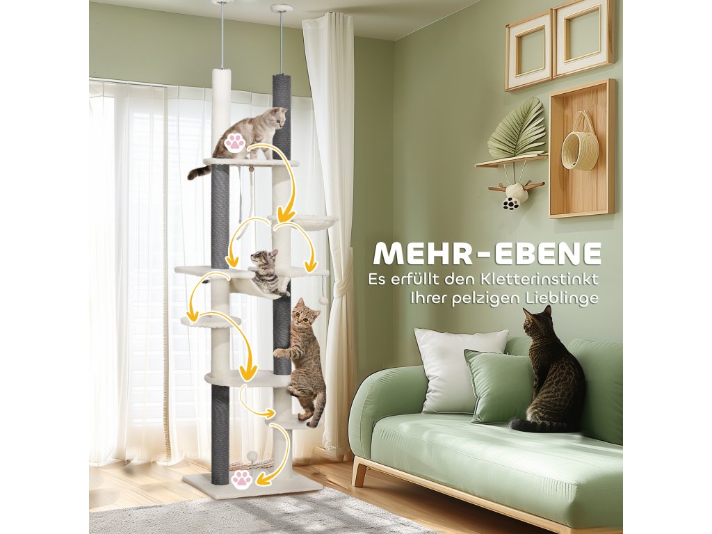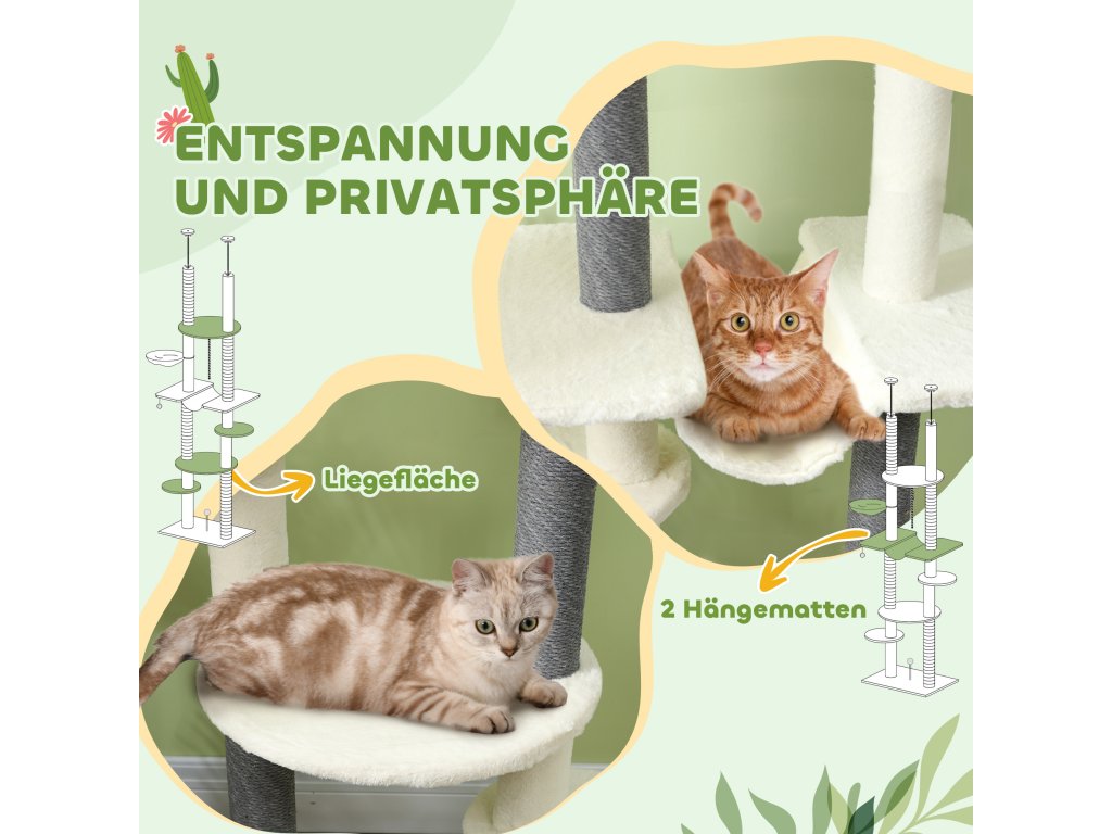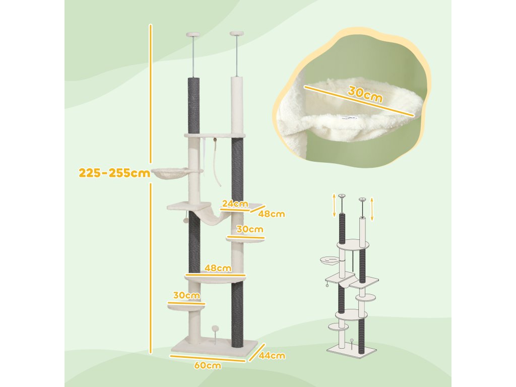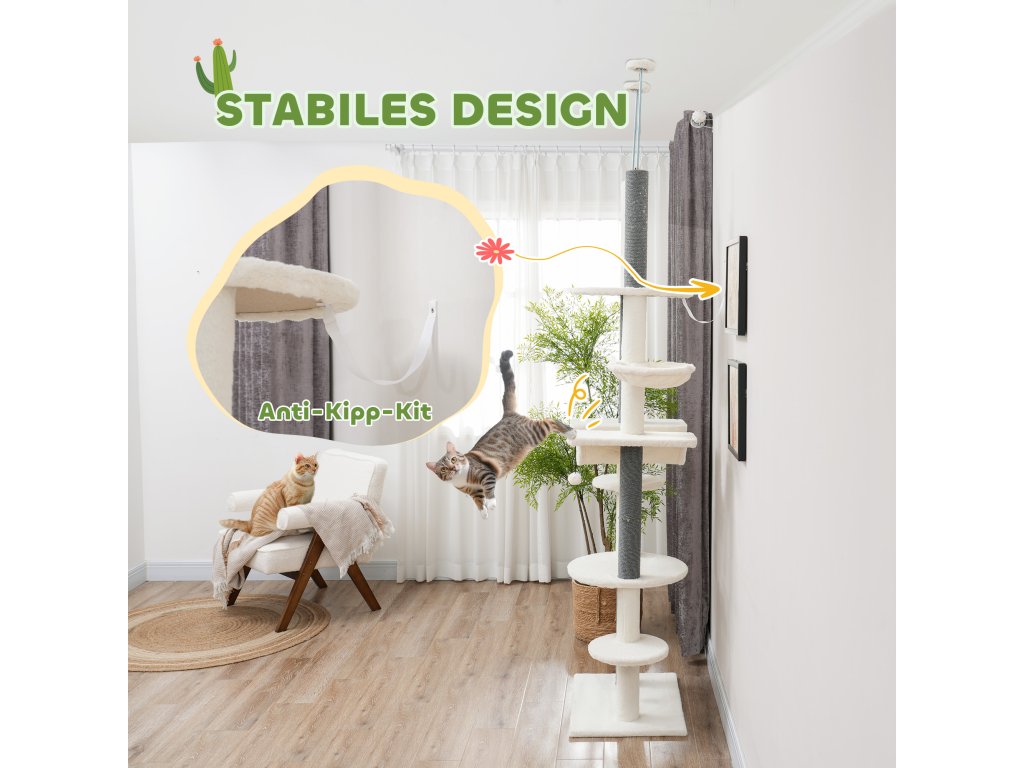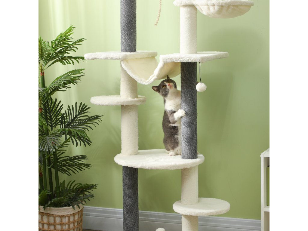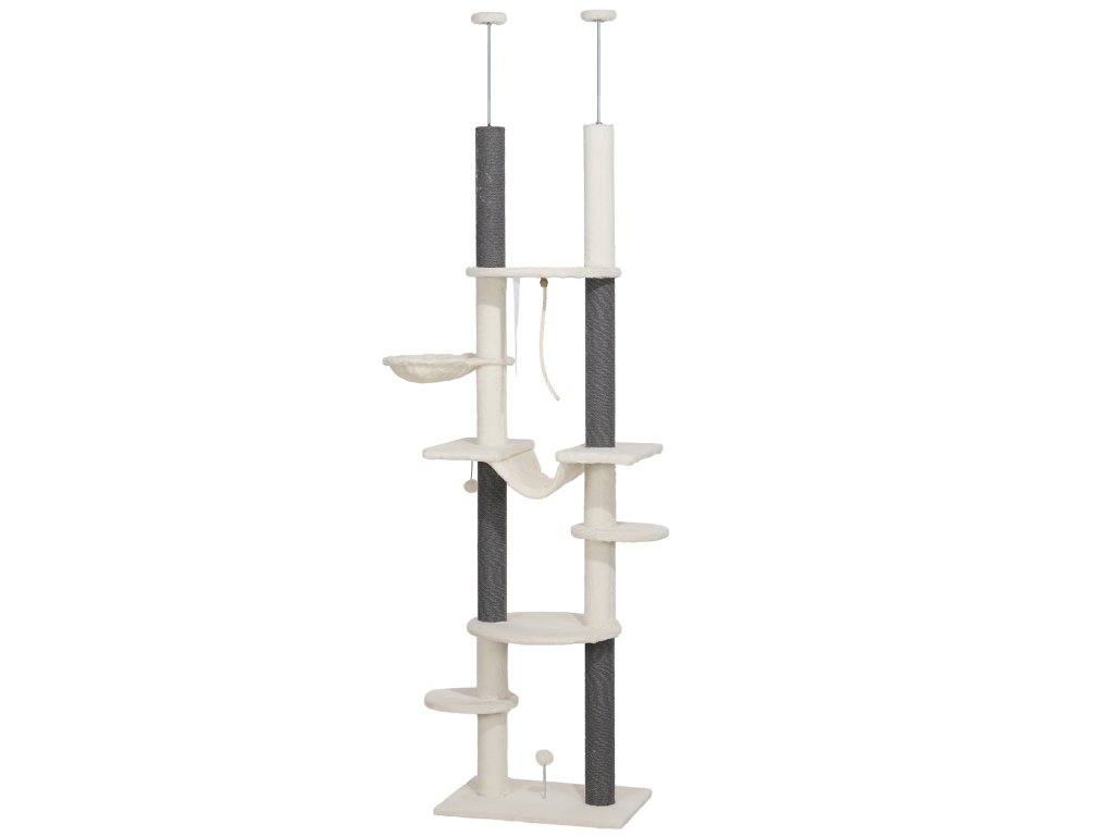 Škrabadlo PawHut, stropní, nastavitelné 225-255 cm, plošiny a houpací sítě, ochrana proti převrácení, bílé