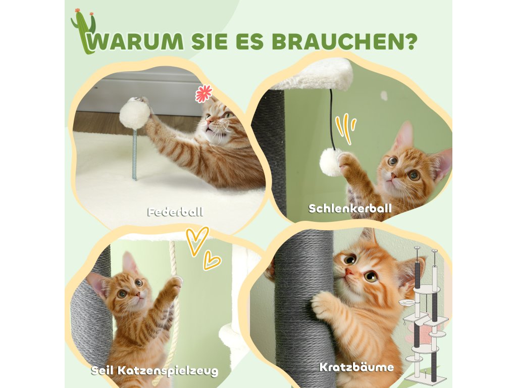- Všestranný hrací prostor: Tento kočičí strom, vybavený několika skákacími plošinami, škrabadly, provazovou hračkou, dvěma houpacími sítěmi a hracími míčky, nabízí nespočet příležitostí ke hře a odpočinku. Udržujte své kočky aktivní a šťastné, zatímco naplňují své přirozené instinkty