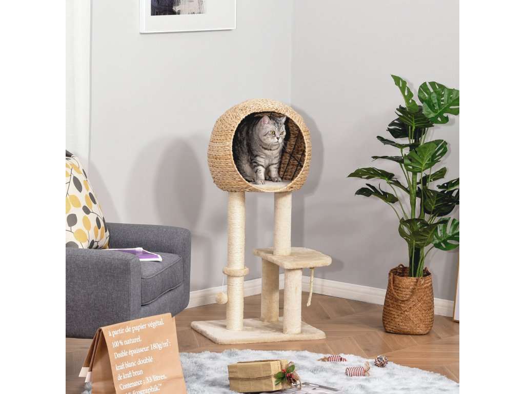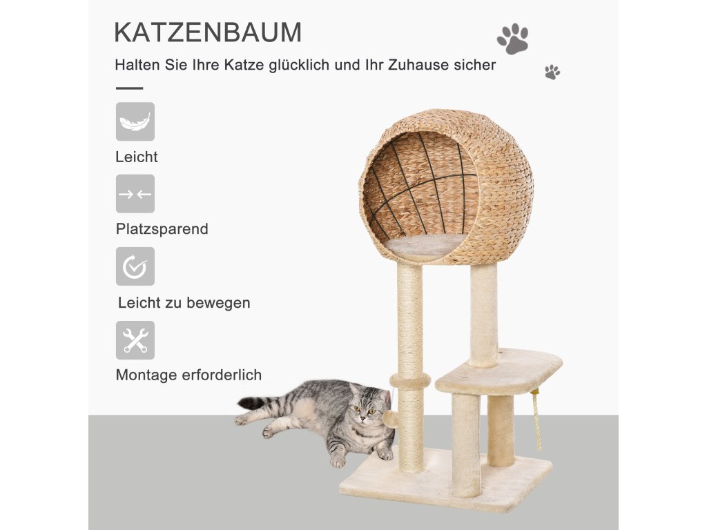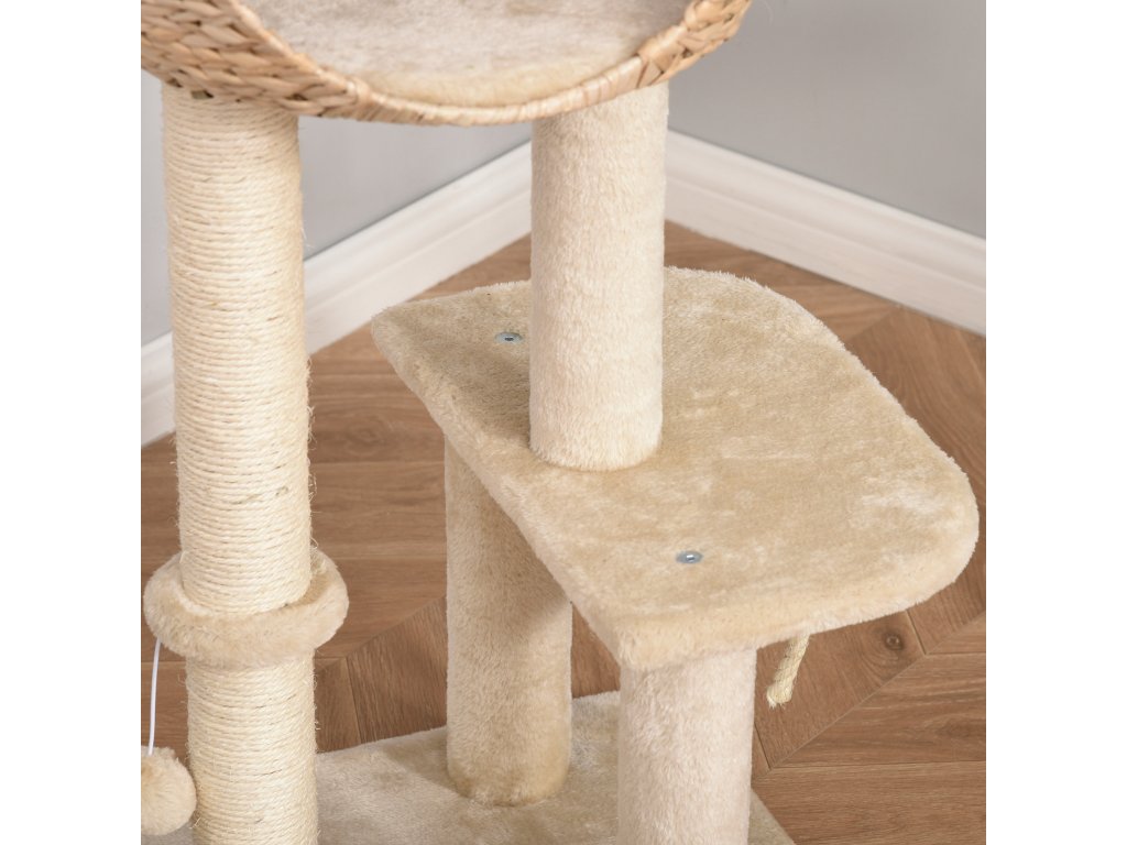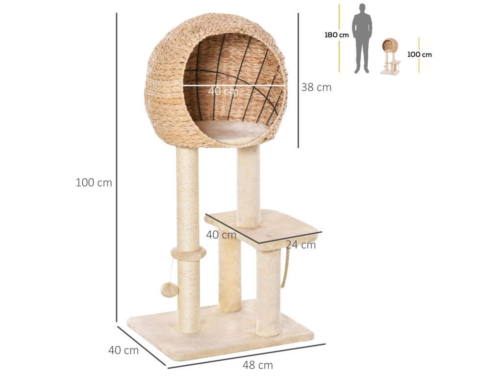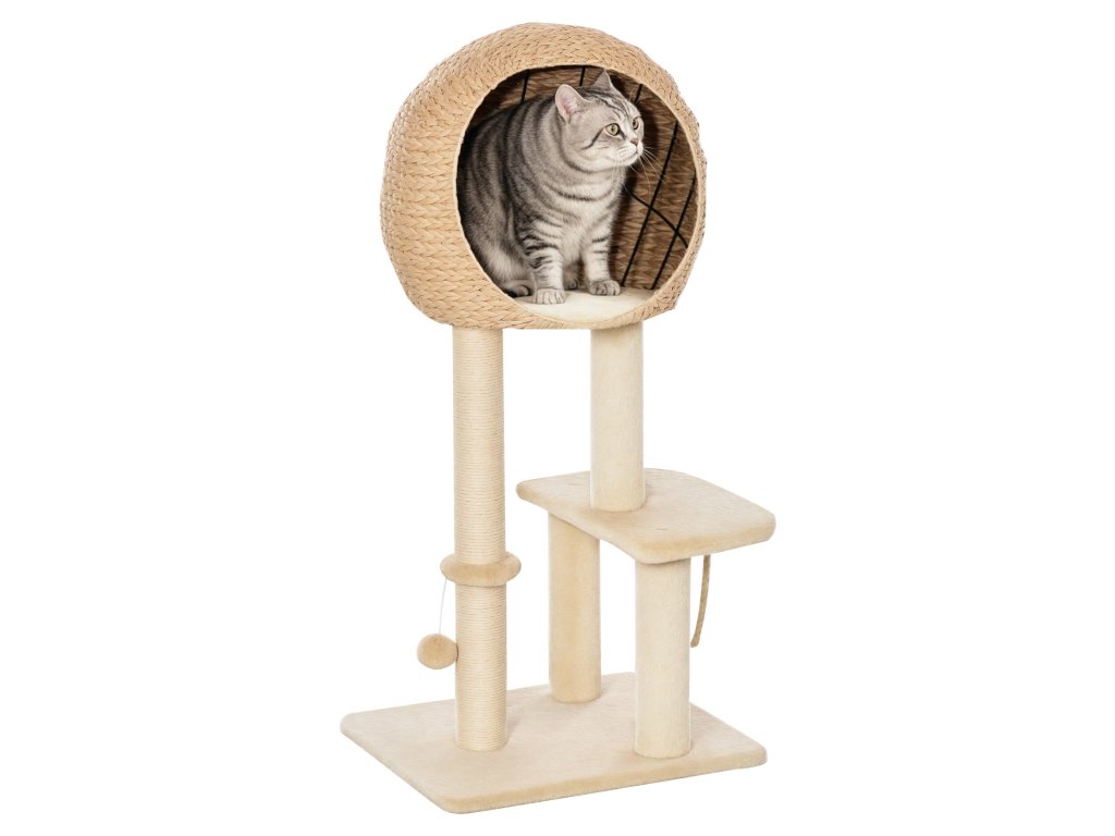 Škrabadlo PawHut 100 cm věž pro kočky s jeskyní, míč na hraní, sisalové sloupky, plošina, vícepatrové škrabadlo pro kočky, šplhací strom, pro středně velké kočky, béžová barva